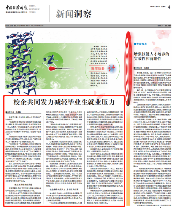 就业是最大的民生,也是高校落实立德树人根本任务的重要一环。近日,《中国经济时报》以《校企共同发力减轻毕业生就业压力》为题,报道经济管理学院就业工作。在采访中,学院党委副书记田丽分析了当前大学生就业困难的主要原因,分享了学院保就业、促就业的经验做法,重点介绍了学院拓宽毕业生就业渠道的有效途径。