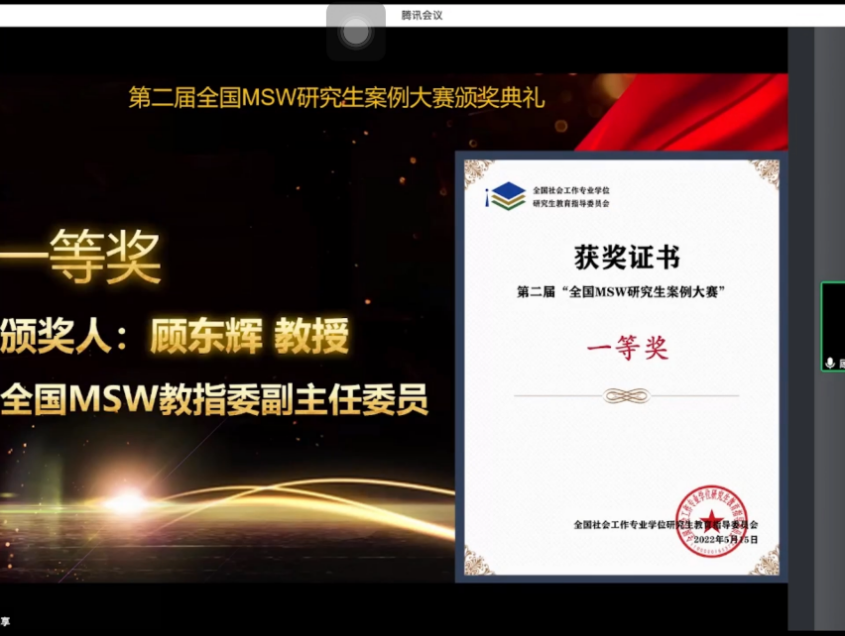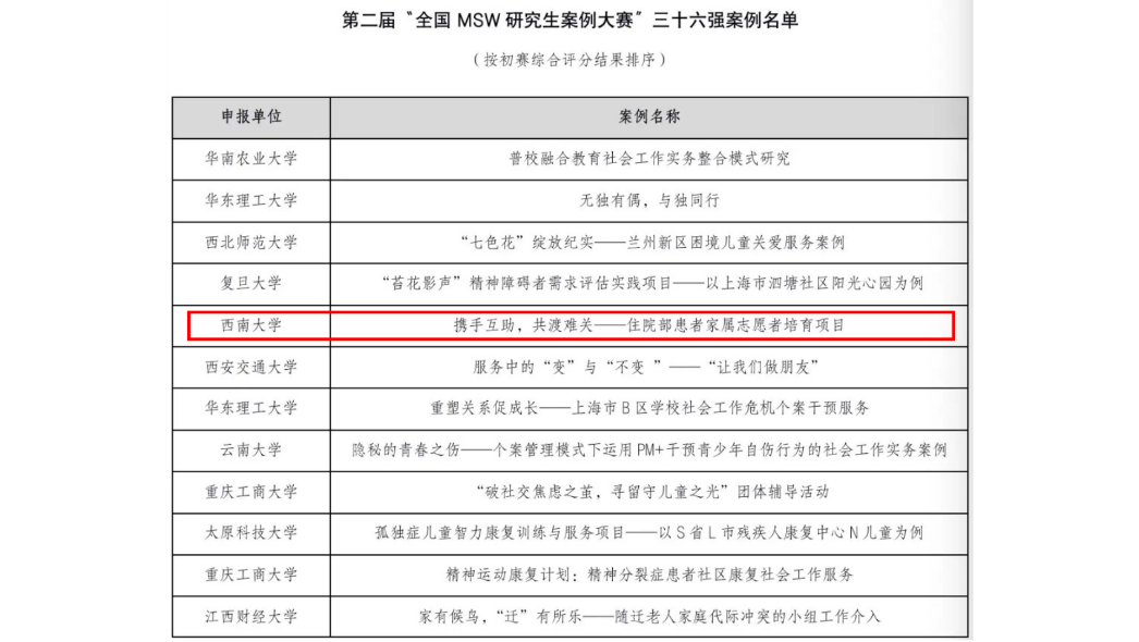 我校国家治理学院谢艳老师指导的,社会工作专业硕士研究生包晓霞、石晶、袁恬恬、赵诗洁、周晓蓉申报的案例《携手互助,共渡难关——住院部患者家属志愿者培育项目》以初赛第五名的优异成绩晋级决赛,并在决赛中荣获一等奖。