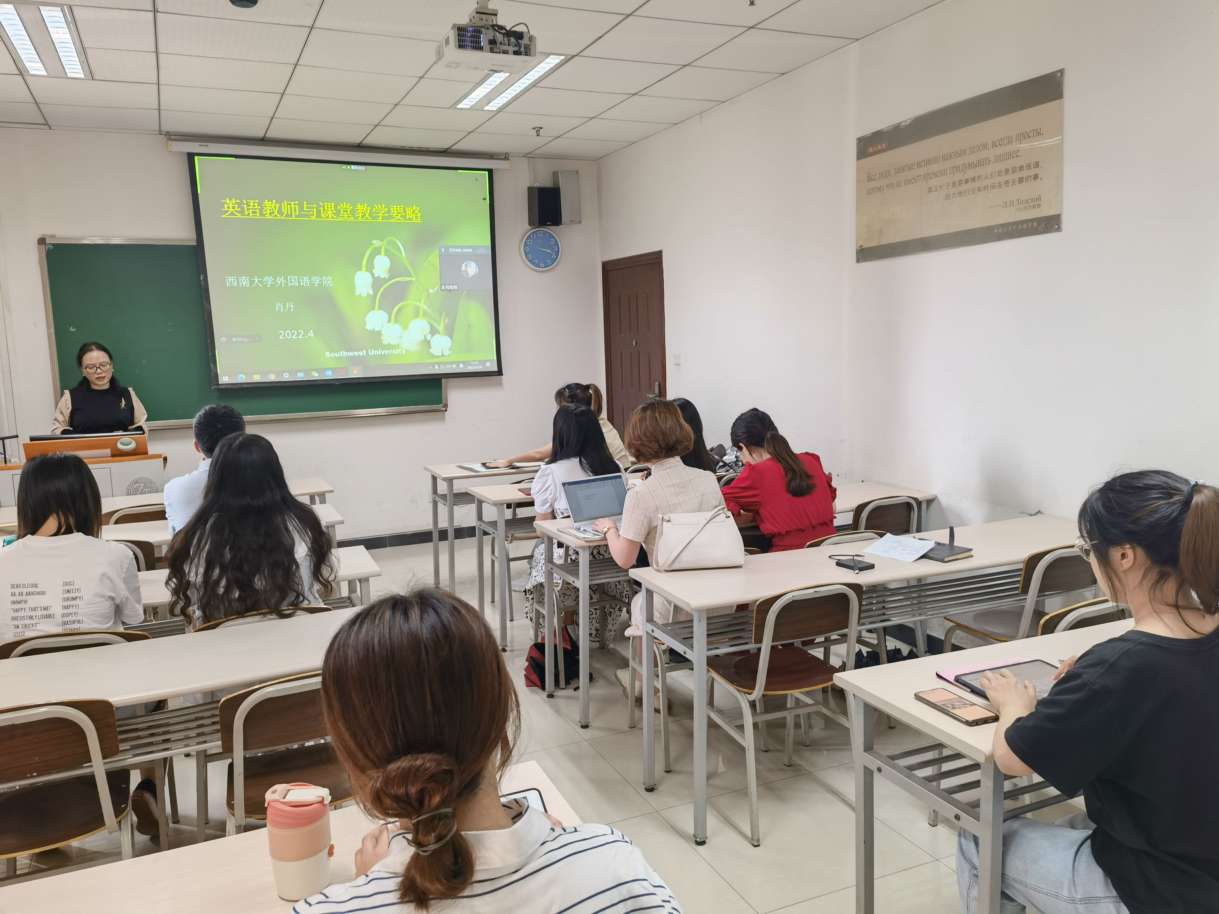 为更好地帮助2022届研究生就业,4月26日,学院邀请肖丹副教授在502教室开展了题为“英语教师与课堂教学要略”的教师技能培训。学院党委副书记张琨,研究生辅导员董典和线上线下共计30余名毕业生同学参加了此次培训。