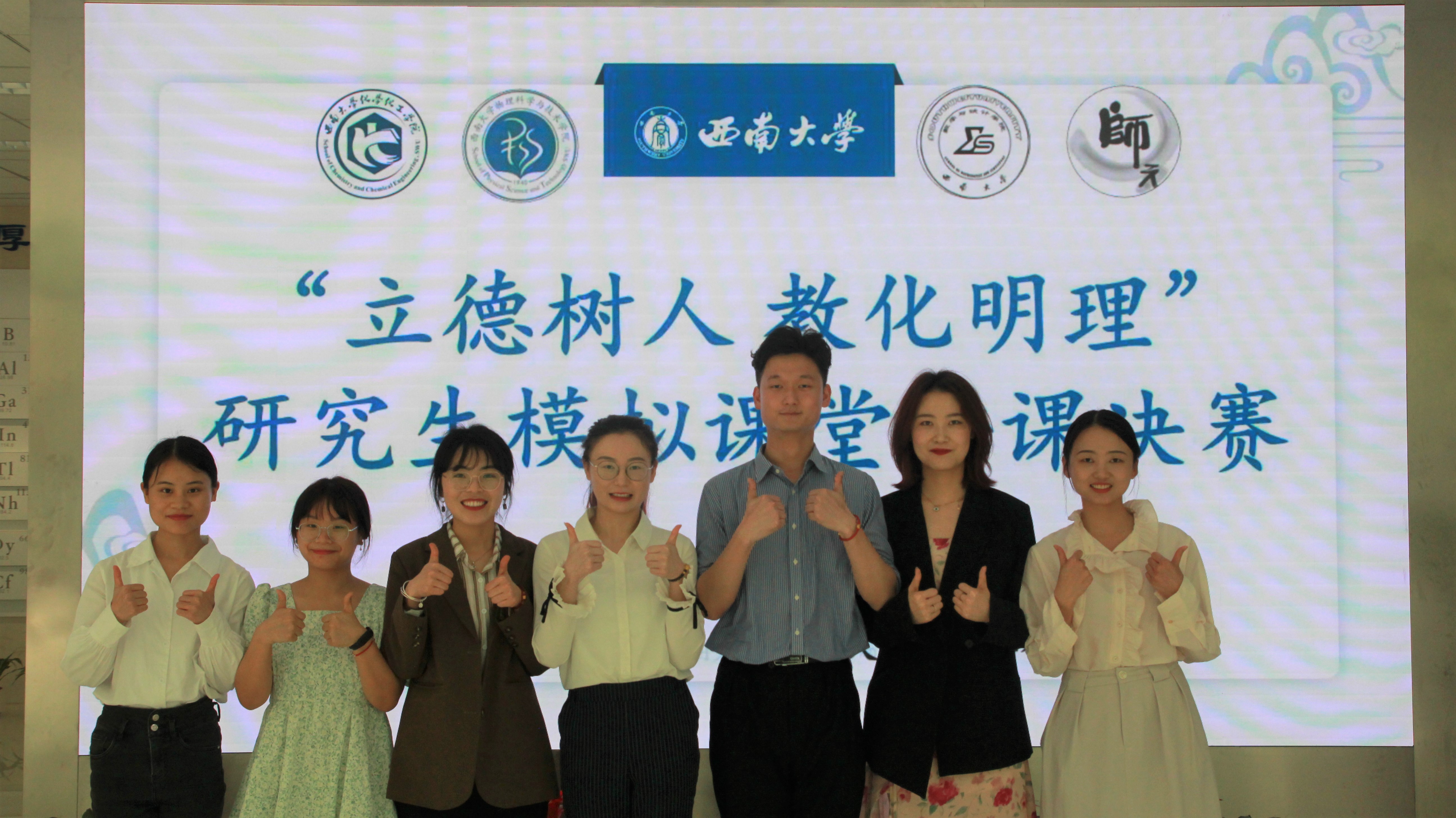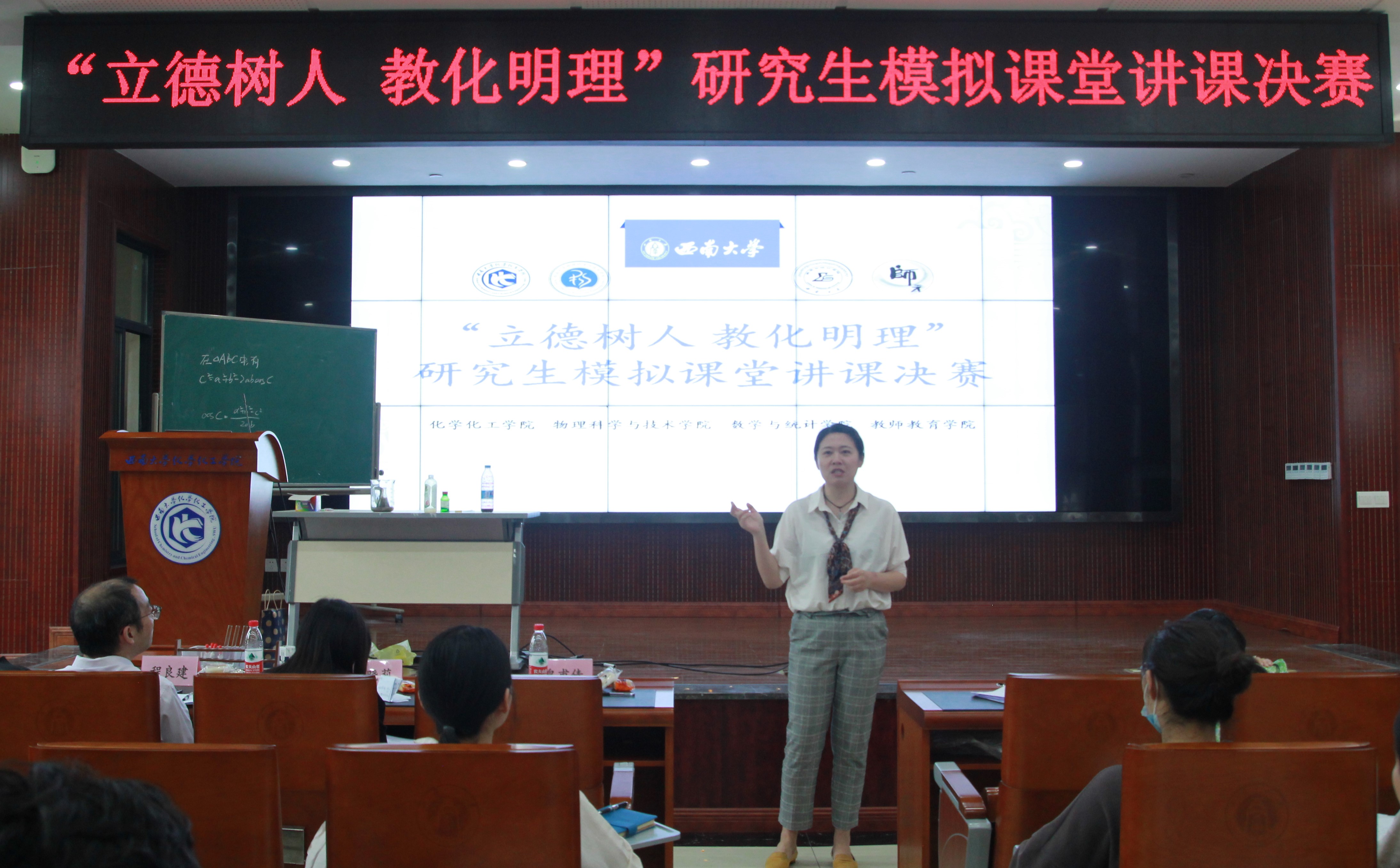 为锻炼研究生的交流能力,促进研究生综合素质和核心素养的提升,betway西汉姆联化学化工学院联合物理科学与技术学院、数学与统计学院、教师教育学院于2022年4月23日上午在化工与药学实验大楼B114举办了“立德树人 教化明理”研究生模拟课堂比赛决赛。经过前期的激烈角逐,共有非专业组18名同学和专业组3名同学进入此次研究生讲课比赛决赛。出席本次活动的嘉宾有教师教育学院皇甫倩老师、物理科学与技术学院陈晓莉老师、数学与统计学院程良建老师、研究生辅导员杨思清老师。