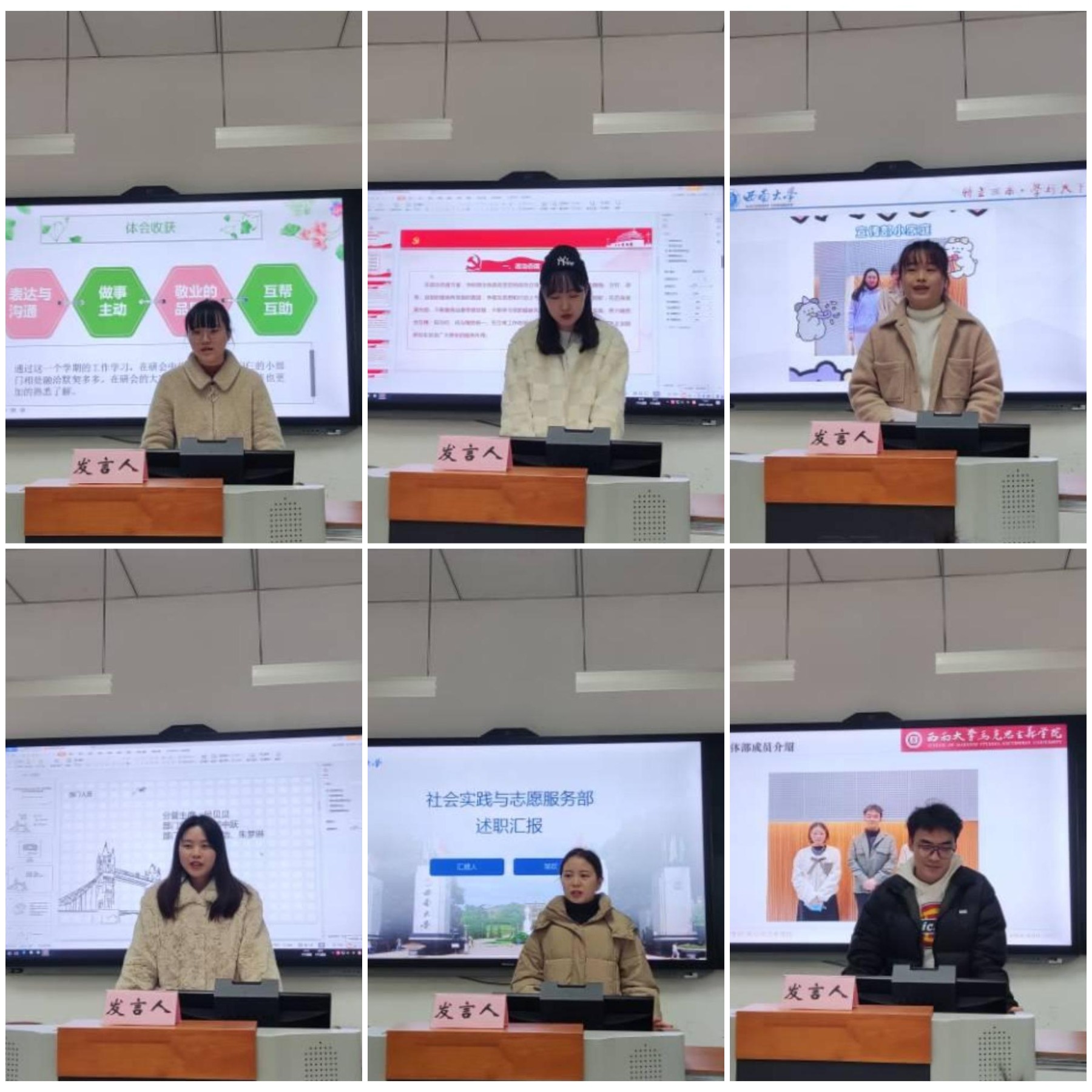 其次,综合办负责人邹方倩、组织部负责人郭中跃、学研部负责人苏童、实践部负责人邹欢、宣传部负责人胡亚晴和文体部负责人张晏宾等六个工作部门负责人从所在部门具体情况出发,依次对所在部门的成员构成、工作职能和任务目标进行了简要介绍,对过去一学期的部门工作情况及个人履职情况进行了总结汇报,分别介绍了各部门工作中取得的成绩、存在的不足以及今后努力的方向。