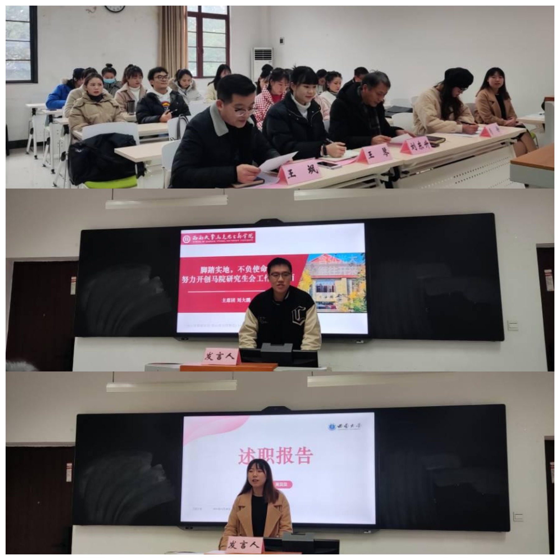 会议伊始,马克思主义学院研究生会主席团成员和各工作部门负责人从政治态度及道德品行、工作能力及表现、纪律作风及服务态度等方面依次作述职报告。