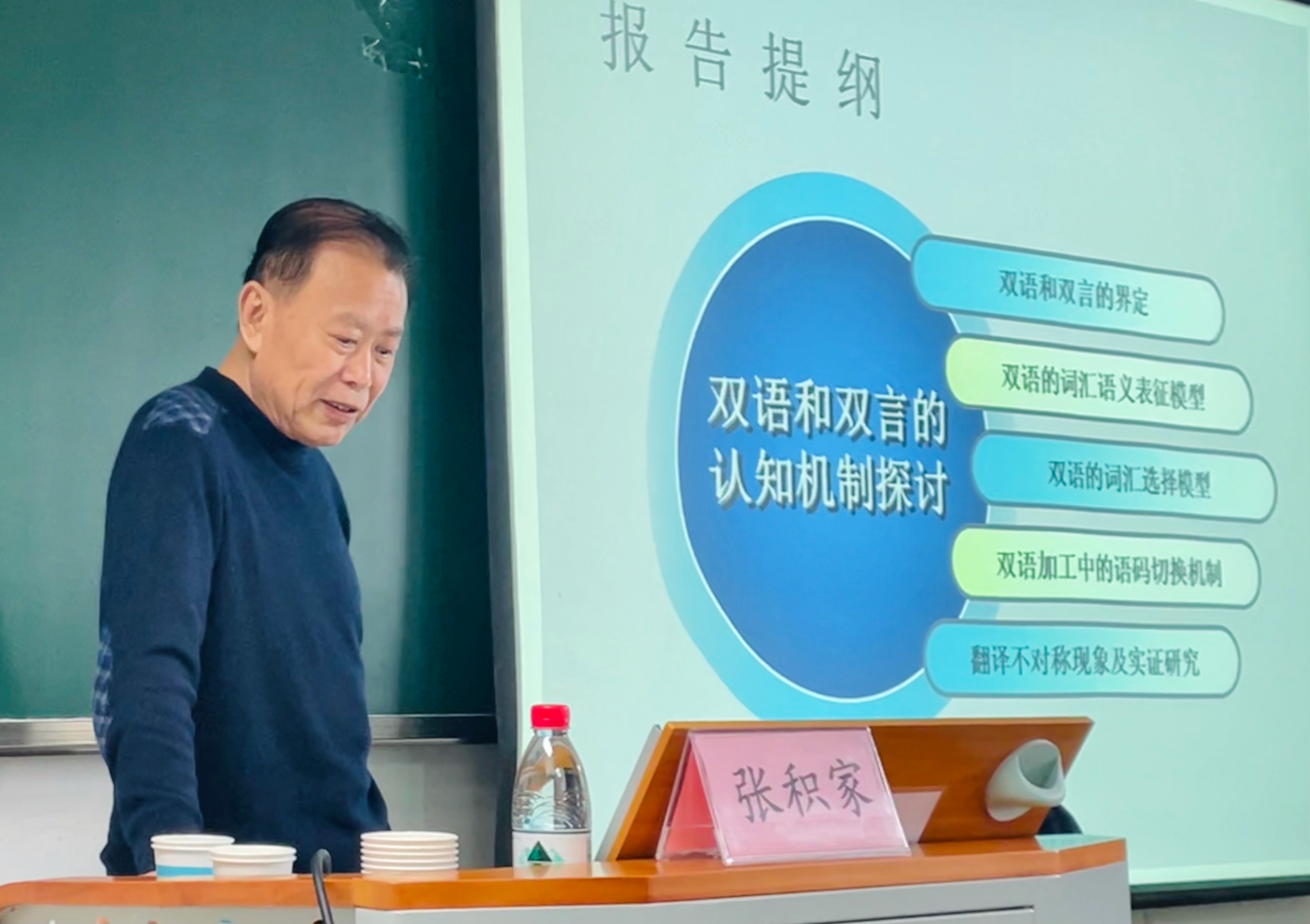 讲座过程中,张积家教授对藏-汉-英双语者词汇与语义表征研究、藏-汉-英双语者字词识别中的语码切换及其代价、汉-英双语者言语理解中语码切换的机制、熟练汉-英双语者的语码切换机制、双语和双言对图片命名和分类的不对称影响、不熟练中-日双语者同形词和非同形词的隐蔽翻译启动效应以及汉英双语者语义饱和效应研究进行逐个讲解,从实验任务、程序、结果及结论对双语者词汇表征及选择的实证研究展开了非常详尽清晰的论述。