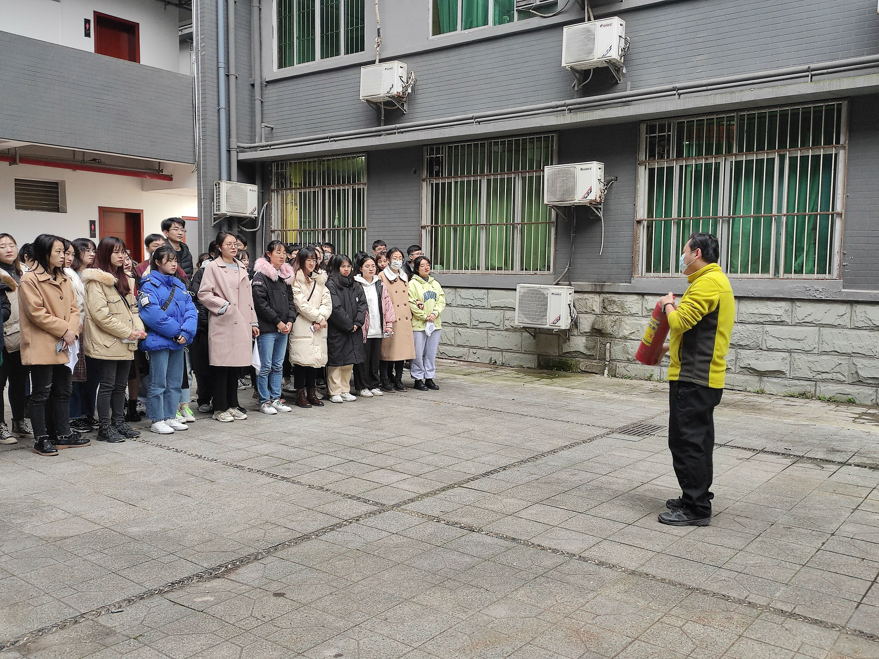 在消防安全疏散演练过程中,同学们在疏导员的指引下弯腰屈身、湿毛巾捂鼻,快速而有序地从高楼层按照指定路线撤离到安全地带。接着保卫处的老师向同学们讲解灭火器使用的注意事项及正确使用方法。谷彩霞老师首先进行了灭火操练,随后同学们依次有序地按照讲解的动作要领进行模拟灭火,对“起火点”实施有效扑救。