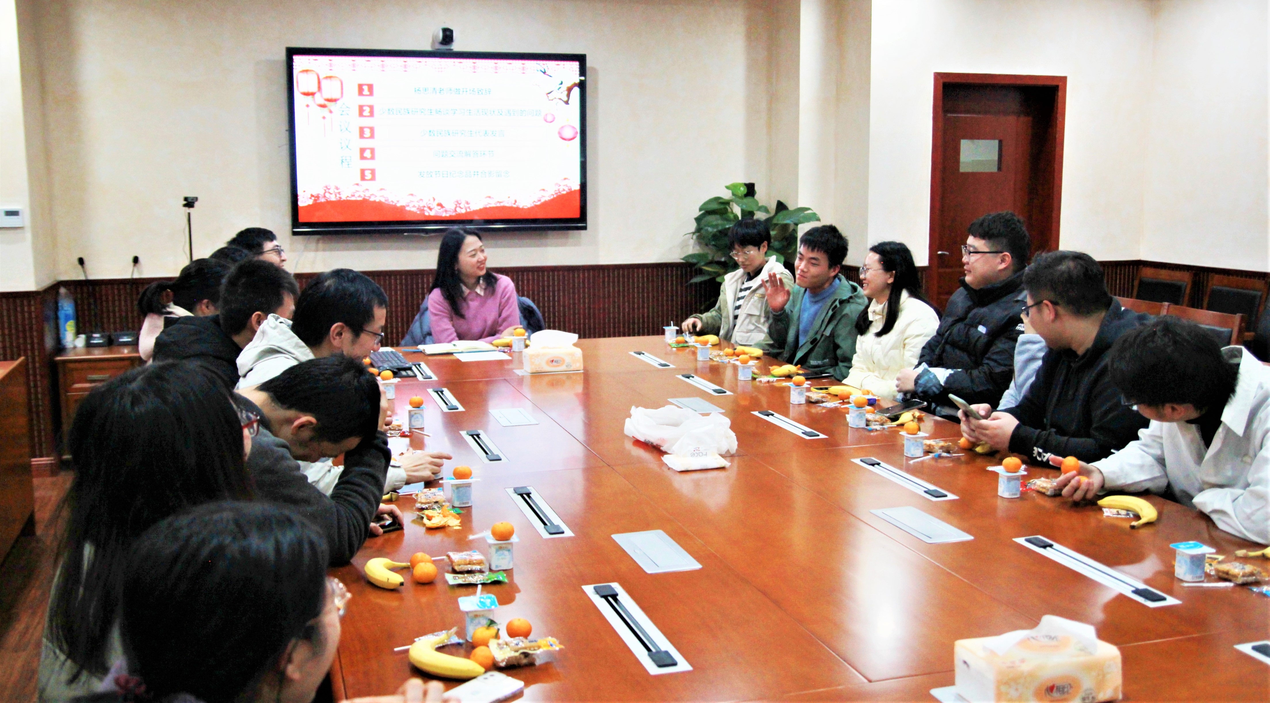 随后,同学们依次进行发言,他们首先对学校和老师们给予少数民族研究生深切关怀表示感谢,接着围绕民族传统文化、家乡习俗、学习生活情况等内容,畅谈感受和体会。来自土家族的2021级博士研究生张子龙分享了土家族有趣的风俗活动,并结合自己多年来的读研经历,在学业上给大家提出了宝贵的建议。来自彝族的2019级研究生普航为大家介绍了彝族的篝火晚会,并表示科研路漫漫,身心健康很重要,希望大家始终保持良好的心态。会议现场氛围轻松愉快。