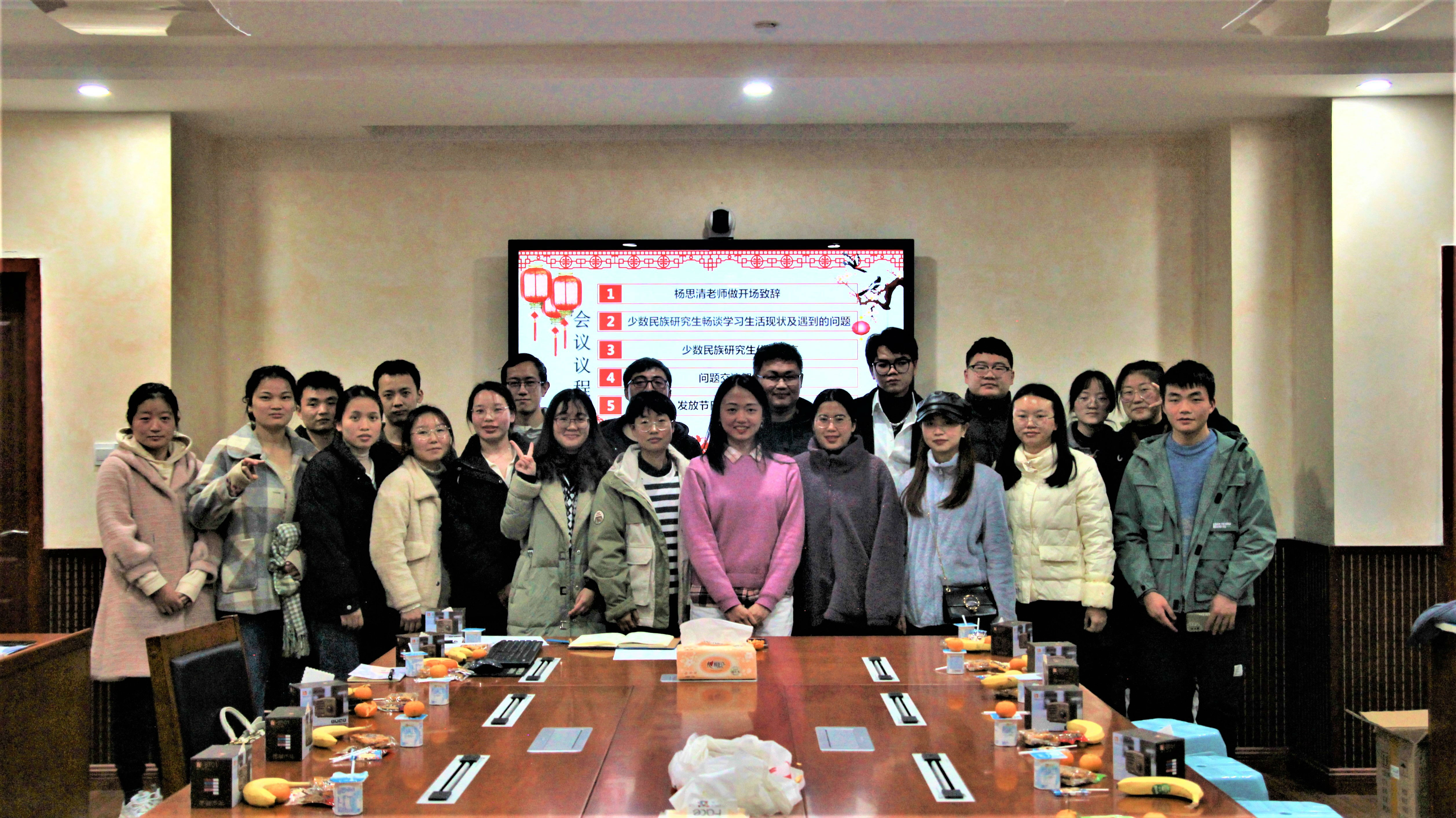 讲话结束后,杨思清老师为在场少数民族研究生送上纪念品,对大家表达了美好的祝愿,并进行合影留念。