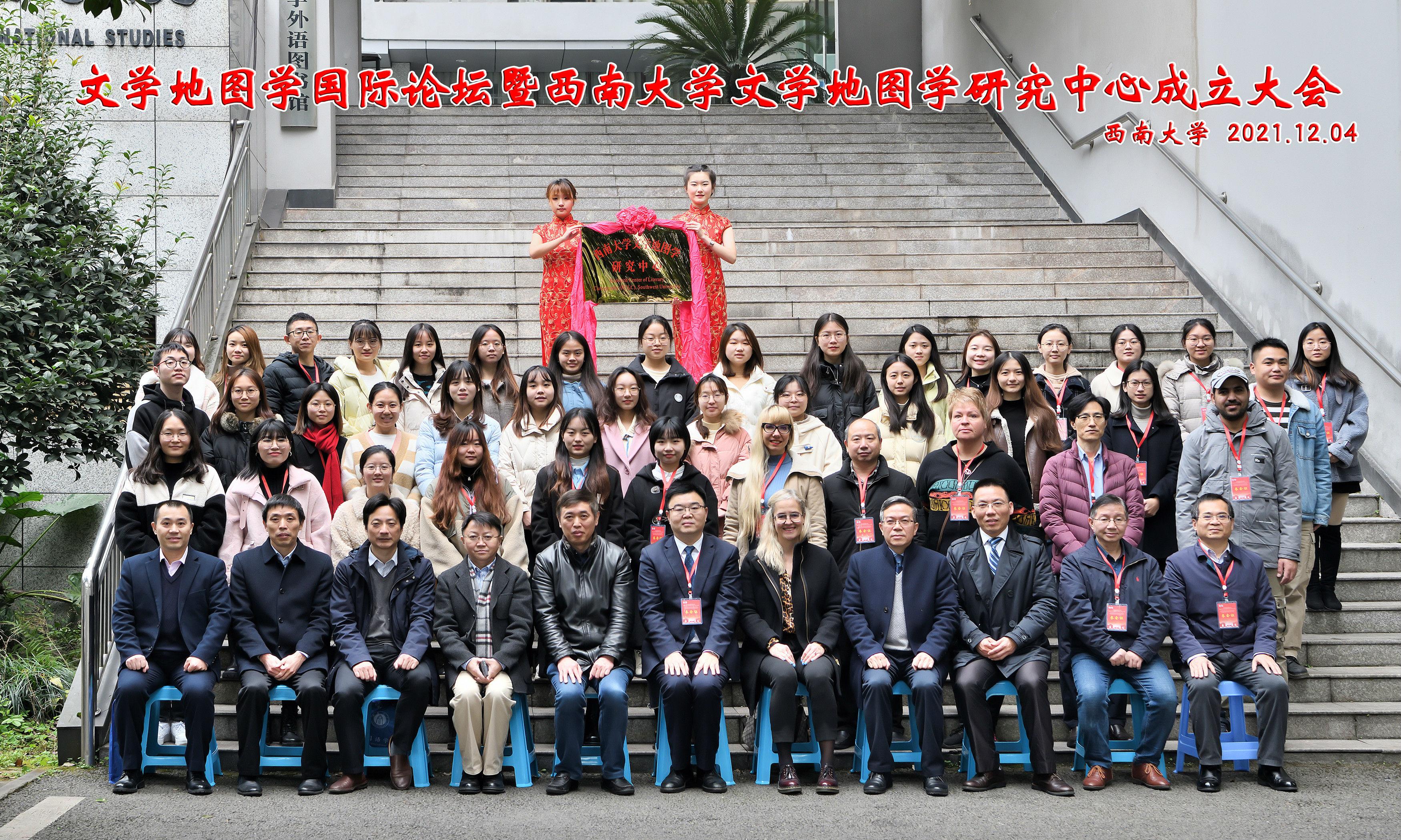 欢迎致辞结束后,激动人心的揭牌仪式紧随其后。四川外国语大学董洪川校长和betway西汉姆联党委潘洵副书记共同为中心揭牌,并与中心主任郭方云教授合影留念。至此,betway西汉姆联文学地图学研究中心正式成立。揭牌仪式结束后,到场的专家学者及师生在外国语学院一楼合影留念。