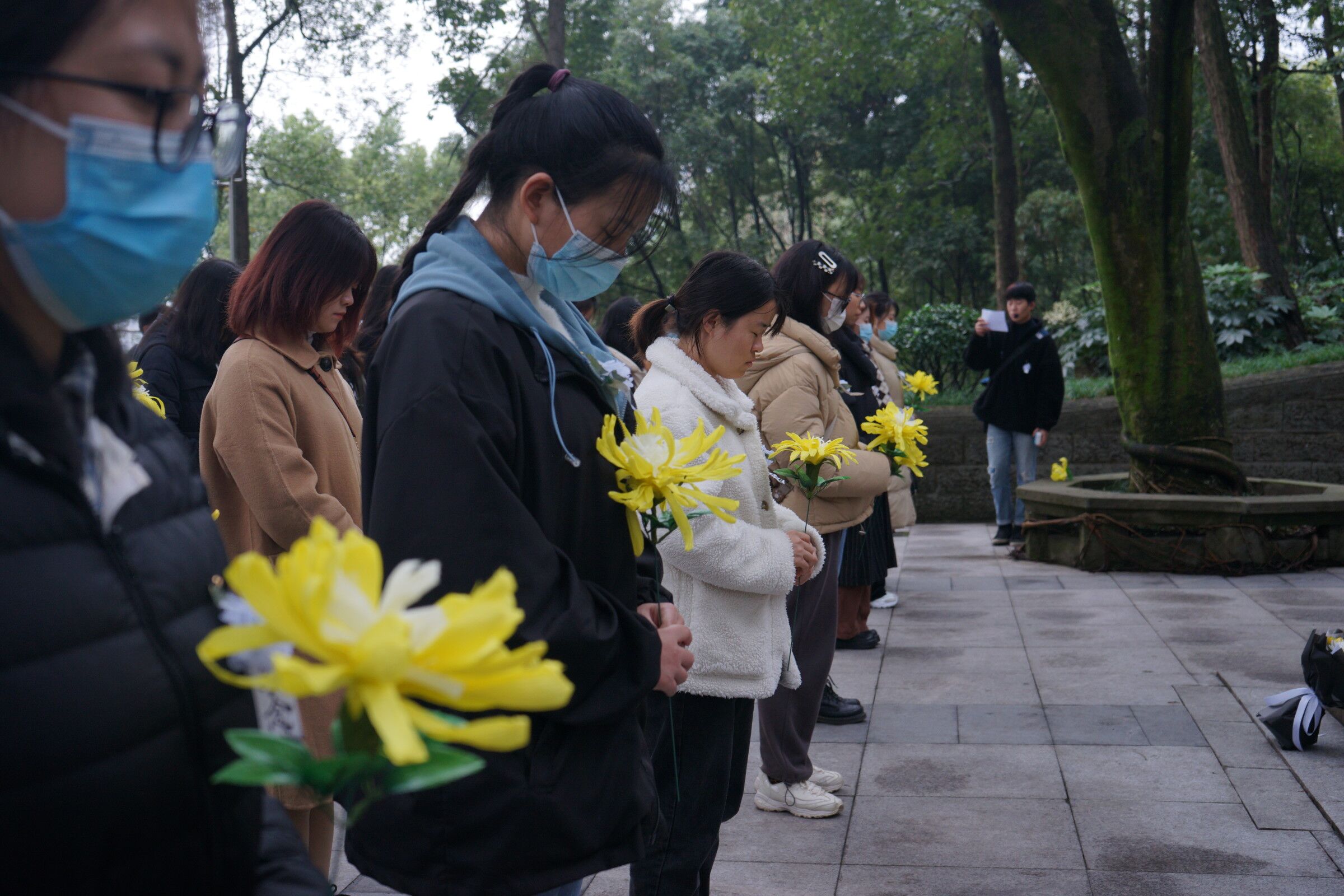 紧接着,全体脱帽肃立,默哀一分钟并于墓前三鞠躬。