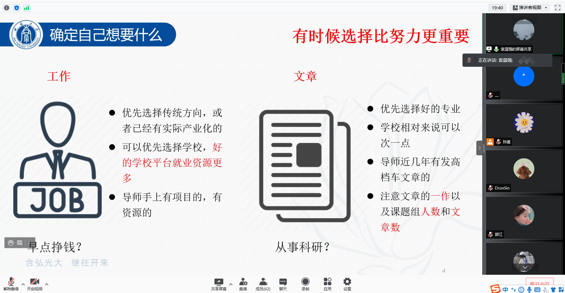 最后,杨老师对此次分享会做了总结。她表示在当前严峻就业形势下,广大研究生应根据自身的特点,积极转变就业观念,认清就业形势,培养自我意识,对自己未来的职业方向有清晰的认识,把握好就业机会、增强竞争择业和服务基层的观念,遇到挫折时要正确面对,调整好心态,以最佳的状态去迎接崭新的明天。