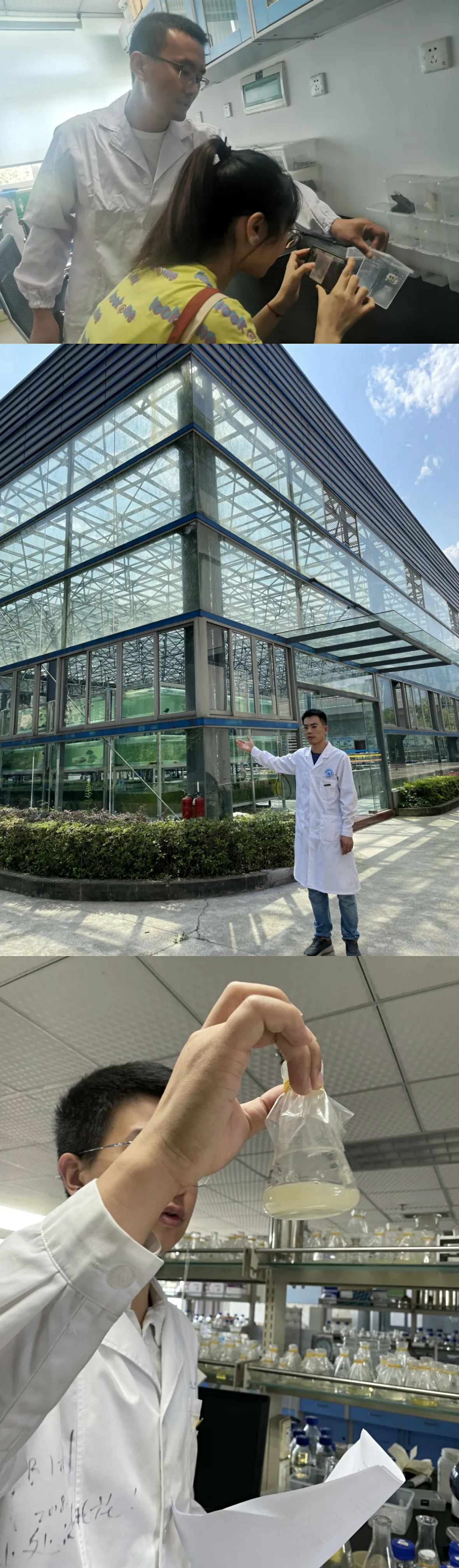 张芳源老师从实验室的基本情况到成果产出,向营员们进行讲解,带领同学们探索青蒿的奥秘。李昌晓老师讲述生态学的师资情况及野外基地,通过实验室具体的实验项目,逐渐深入讲解生态学的具体工作,为营员们提供清晰易懂的生态学实验室解说。许长征老师介绍植物学的师资力量,着重对实验室的研究方向、成果产出、仪器设备展开讲解。最后向营员们简要介绍研究生毕业的去向,赢得众位营员同学的一致好评。王露雨老师、吴润标博士、樊征博士分别就“蜘蛛科普类著作”“蜘蛛类群的食性研究”“水蛛的生物学习性和功能研究”展开了深入浅出、风趣幽默的讲解,并向营员们展示蜘蛛样本。龚真博士从微生物学科、导师简介、实验室生活文化三个方面进行讲解,随后带领营员参观实验室结构及学生生活。李明辉老师、陆宝悦博士、周鑫硕士带领营员深入了解由王德寿老师带领的水产所生化、水生生物学、动物学实验室,重点介绍实验室主要的研究领域与应用范围、仪器设备、技术支持等,此外向营员们介绍了1200平养殖大棚及养殖基地。何建波老师、莫大双博士对实验室教师团队做简短的介绍,随后讲解实验室主要研究方向及成果,并重点介绍小鼠这一模式动物的相关研究,同时向营员们介绍实验室动物房的规模、重要仪器设备、地理位置等,帮助同学们深入了解发育生物学实验室。每次参观完各实验室,营员们都积极踊跃的向专业老师提问,其中包括实验室研究课题、实验操作、出野外情况以及工作去向等问题,老师们耐心细致地解答,与学员们热情探讨,暖心鼓励,彰显为人师的风采。