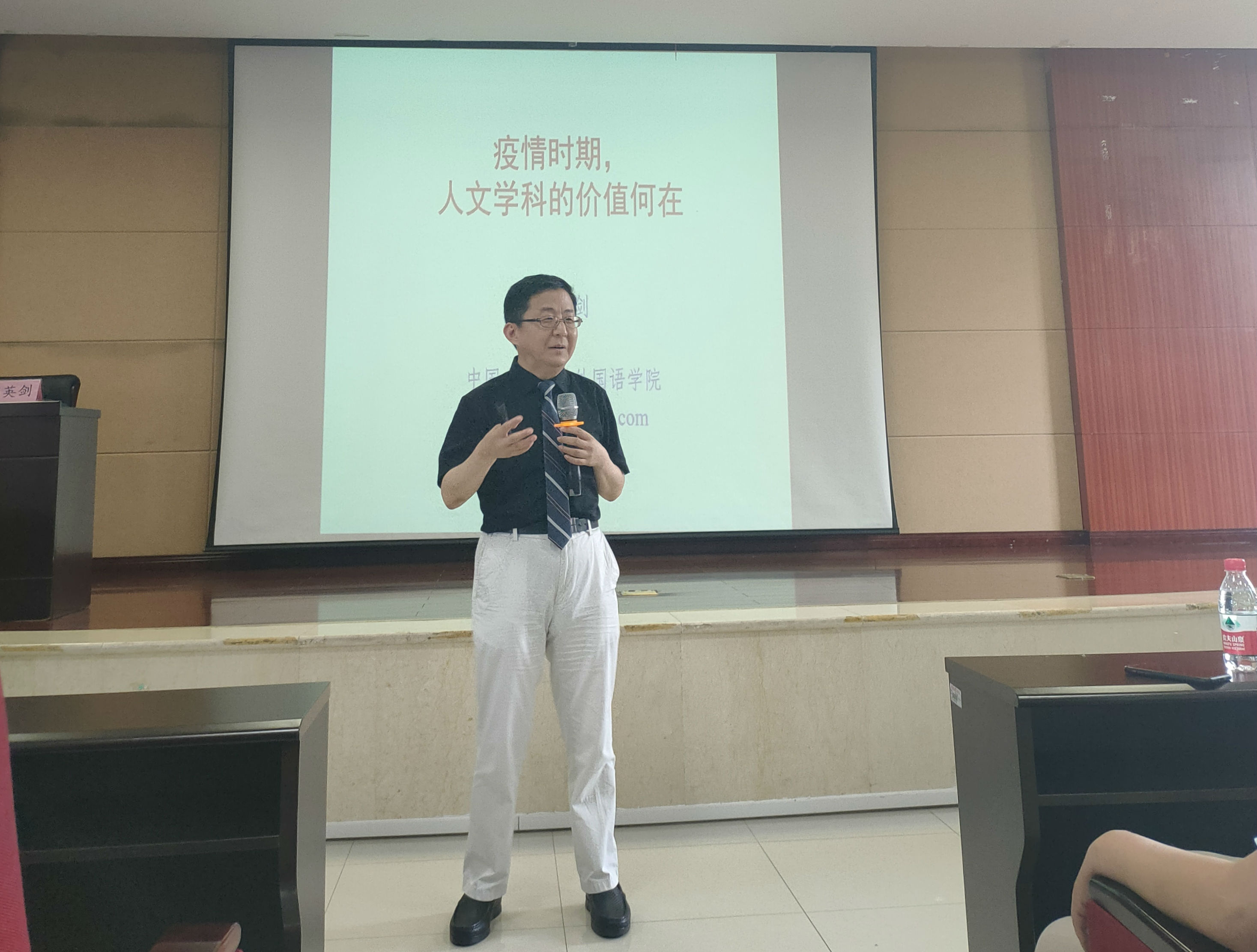 接着,郭老师基于当下形势分析了人文学科尤其是语言学科的价值所在。首先,郭老师提到学习语言,特别在今天学习外语,重要性体现在三个方面:第一,语言是交流的媒介。第二,语言是观点以及思想观念的载体。第三,不同的语言可以提供多元化的信息与来源。其次,郭老师以我们的身边的事例为例,阐述了人文学科的重要性。通过著名作家张海迪、“希望工程”女孩苏明娟、领导人署名文章、马云对儿子的寄语,纪录片《后浪》和《我不想做这样的人》以及“躺平”的含义这七个事例,郭老师分享了自己对于人文学科重要性的思考,并指明人文学科存在的意义之一就是要纠正文字不正之风。人文学者必须说出自己的看法以及观点,与他人进行辩论,才能明辨是非,洞悉错误。