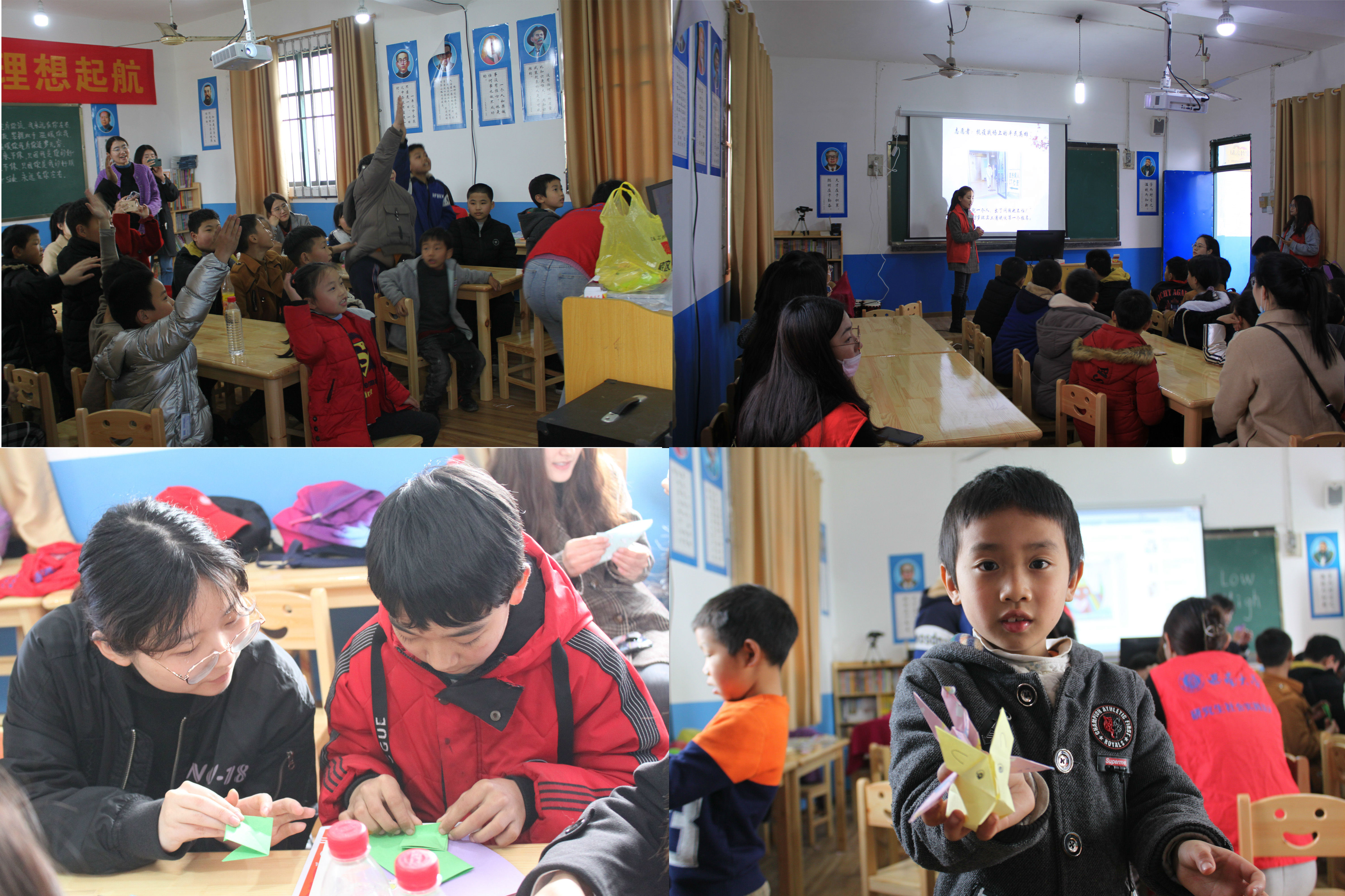 在课余时间,志愿者们带领同学们一起开展手工制作和美术绘画活动。孩子们自由地挑选喜欢的绘画材料进行创作,既锻炼了孩子们的动手绘画能力,提高他们的色彩搭配能力,又丰富了他们的课余生活。