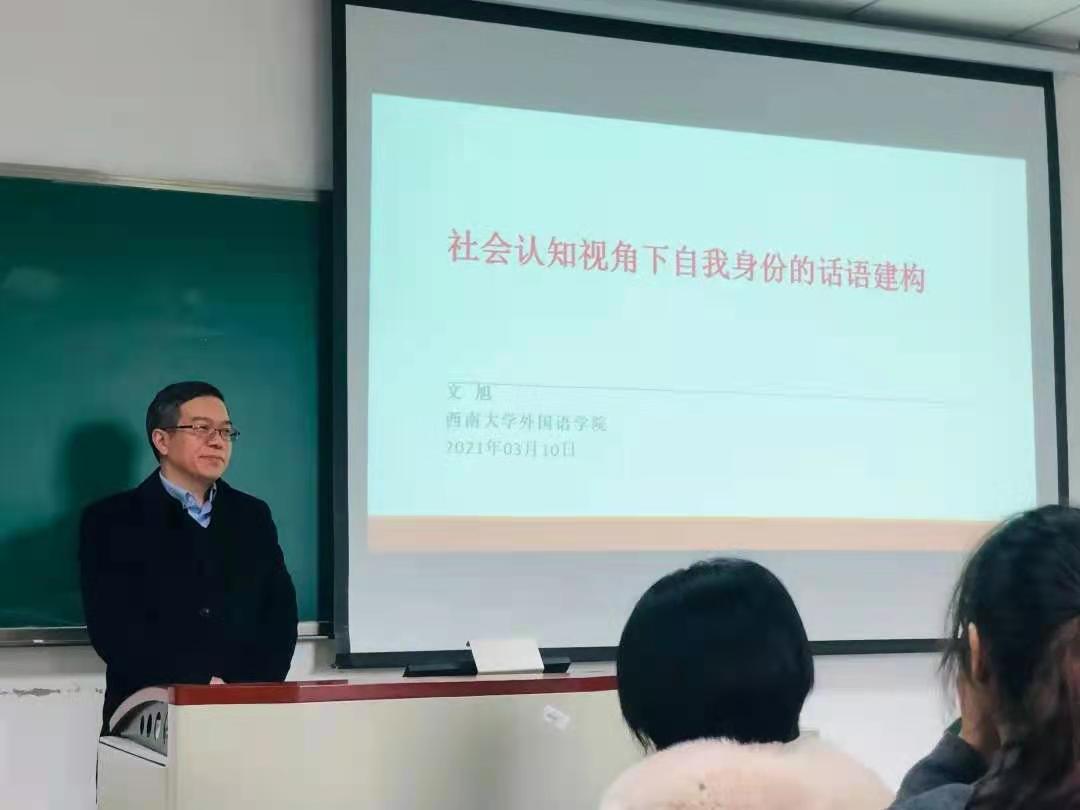 讲座开始,文旭教授以《说岳全传》和《破壁记》中的故事为例,分析了其中称呼语的使用与文本中人际交流失败的关系,指出其失败根源于说话人自我认知的不同,由此可见,身份的合理话语建构对言语交际的成功非常重要。本讲中,对于社会认知视角下,说话人自我身份的话语建构,文教授提到了三个关键词,社会认知、自我身份和话语建构。