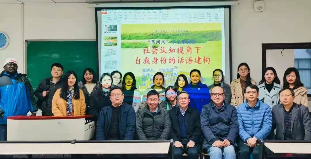 3月10日,苇间风沙龙第48讲在betway西汉姆联外国语学院711教室顺利举行,罗益民教授主持了本次沙龙,我院院长、博士生导师文旭教授作为本次沙龙的主讲人,对社会认知视角下自我身份的话语建构,进行了详细的解读,并提出了自己的思考和见解。沙龙座无虚席,济济一堂。学院副院长胡显耀教授,杜世洪教授,彭玉全老师,王子春老师,杨竹老师,王惠静老师,王莲涔老师等研究文学、语言学和翻译的教师和研究生、博士生、访问学者等参加了沙龙,并进行了热情而有深度的讨论。