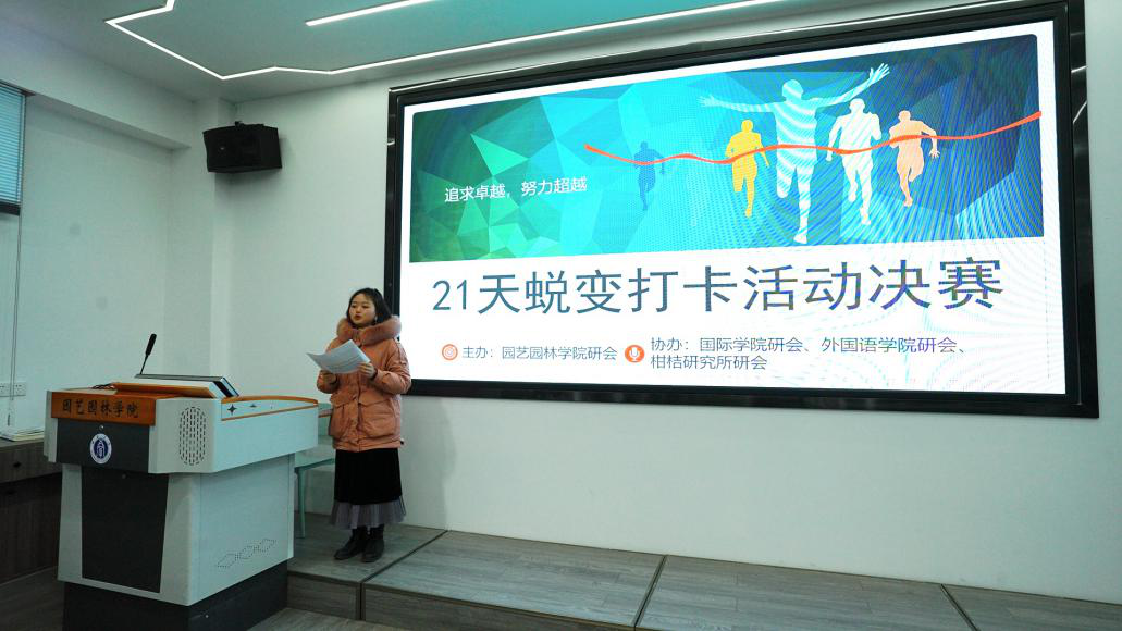 为建设优良学风,调动研究生学习和运动积极性,推动研究生深入学好“四史”,园艺园林学院研究生会积极响应学校号召,成功主办了“梦想·蜕变·成长”21天打卡挑战活动。此次活动的协办方有国际学院研究生会、外国语学院研究生会和柑橘研究所研究生会。