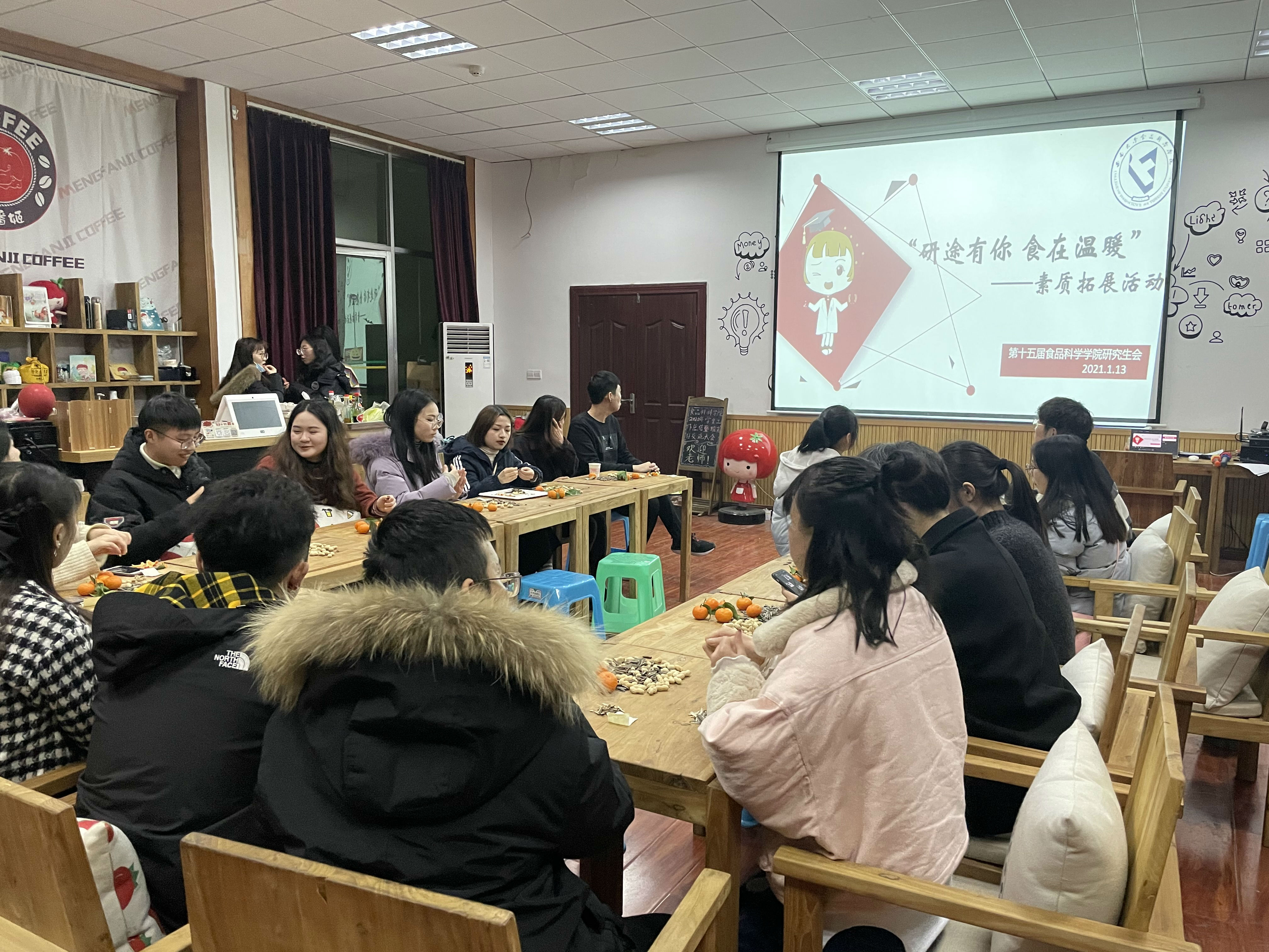 2021年1月13日下午18:00,betway西汉姆联食品科学学院“研途有你,食在温暖”研究生第二期素质拓展活动在39教U食智造创客空间举行。此次活动由食品科学学院研究生会秘书处主办,研究生辅导员张欢老师和研究生会成员们共同参与。旨在促进各部门成员之间的沟通交流,增进相互之间的默契,培养团结协作的精神。