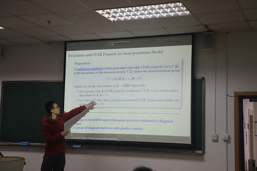 四位专家分别从“空间点过程的半参数贝叶斯分析方法”、“Noetherian形式概形上的完美复形范畴的厚子范畴”、“统计模型的几何性质以及应用”和“非高斯分布中自适应检测的半参数不变理论”四个主题进行讲解。其中焦洁莹专家提到利用一类广泛存在于各个领域的数据类型即空间点数据,刻画特定事件发生的空间位置并寻找随机位置的规律,从而找到可能的影响因素;而鲁澧学者在报告中提到建立Noetherian形式概形X上的完美复形范畴的厚子范畴与X的特定化闭子集之间的一一对应关系;唐梦皎学者在讲座中介绍了关于信息几何的新研究成果:内在损失、测地投影以及在估计融合与检测中的应用等;荣尧学者的报告中引入复多变量椭球等高矩阵分布族的定义, 可用该分布族对非Gauss杂波数据进行灵活地建模, 研究非Gauss杂波中的扩展目标检测问题。
