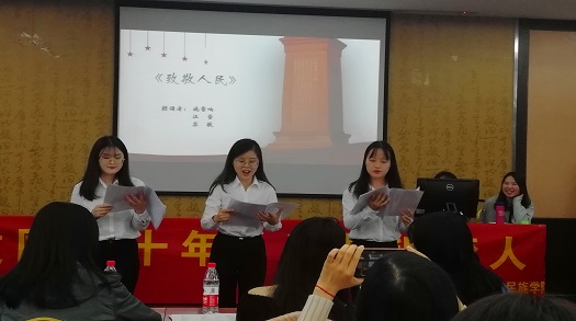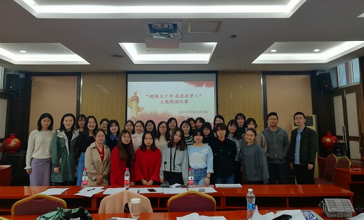 在讲解了比赛规则和主题精神后,下午14:50分,比赛正式开始。由谭小琴小组带来的集体诗朗诵《我骄傲,我是中国人》先声夺人;其后,刘志清的《年轻的城》以声情并茂的发挥获得了在场观众及评委的好评;紧接着,汪雪小组的《致敬人民》集体诗朗诵以其精妙的配合与富有故事性的循循道来令观众为之全神贯注;比赛的最后,由刘豪带来的诗朗诵《祖国啊,我亲爱的祖国》堪称本场比赛的亮点——尽管由于个人原因无法到达现场进行展示,但通过自己录制的朗诵视频,刘豪同学的出色发挥依旧吸引了在场评委嘉宾及观众的注意,综合表现丝毫不亚于现场选手。