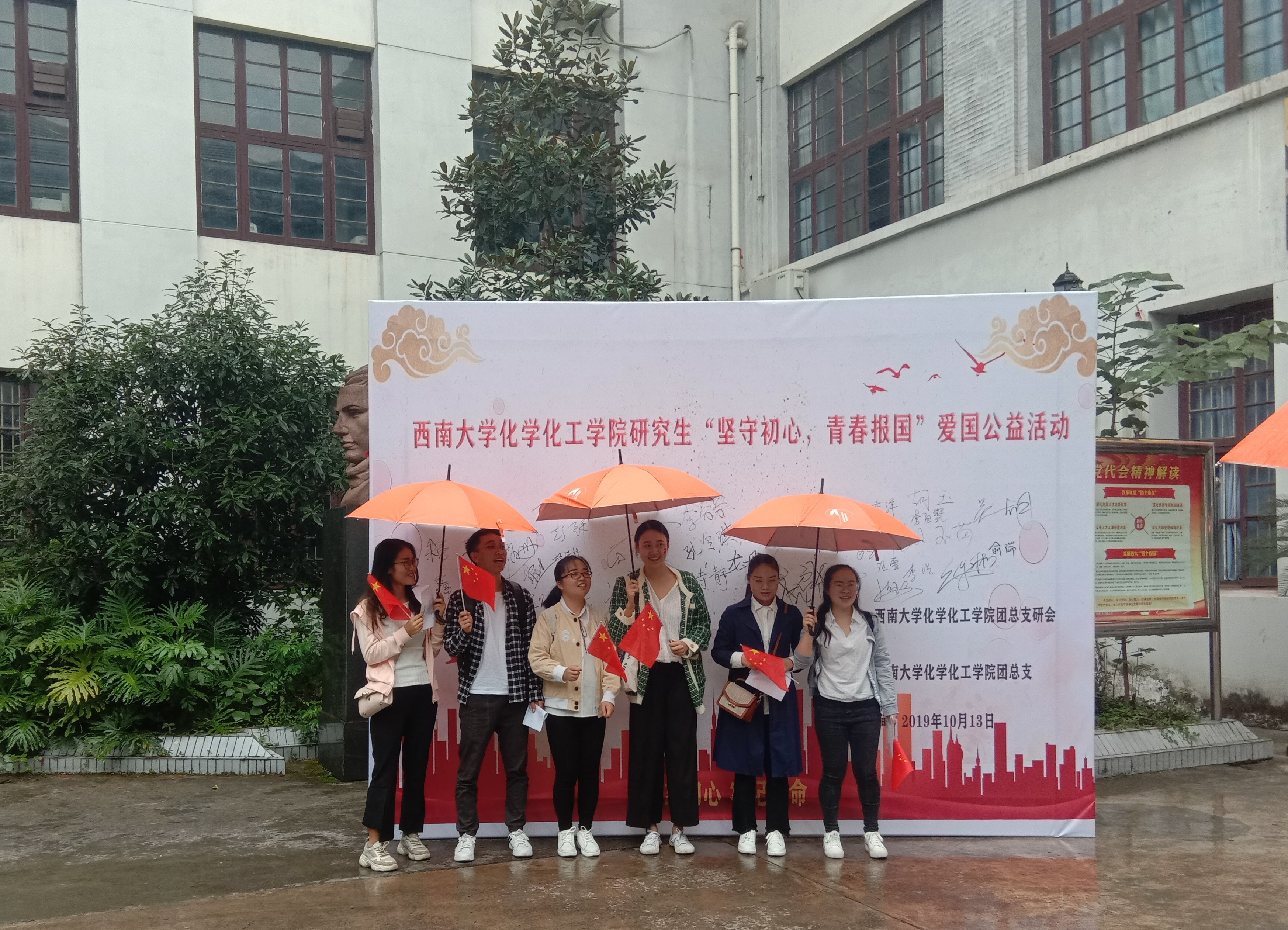 下午13:30,同学们聚集在化学化工学院门口,以参赛队伍为单位,在签名墙上签字留念,并录制视频,送上对祖国的祝福。