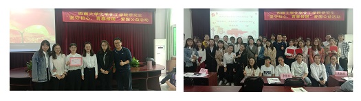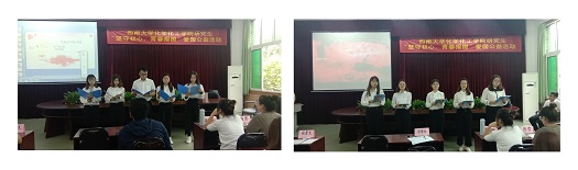 2019年10月13日下午,国庆余热未退,betway西汉姆联化学化工学院研究生“坚守初心,青春报国”爱国公益活动在化学化工学院顺利开展。本次爱国公益活动由化学化工学院研究生会部署,邀请研究生第一党支部书记李帮林老师参与评审,其余四位评委分别为化学化工学院研究生会主席赵晋文,团总支书记王祥昭,社会实践部部长陈雪,2018级课程与教学论专业研究生王淑婷。学院各党支部、各级研究生非党员学生代表自行组织队伍参赛,本次活动一共有十支队伍参与。