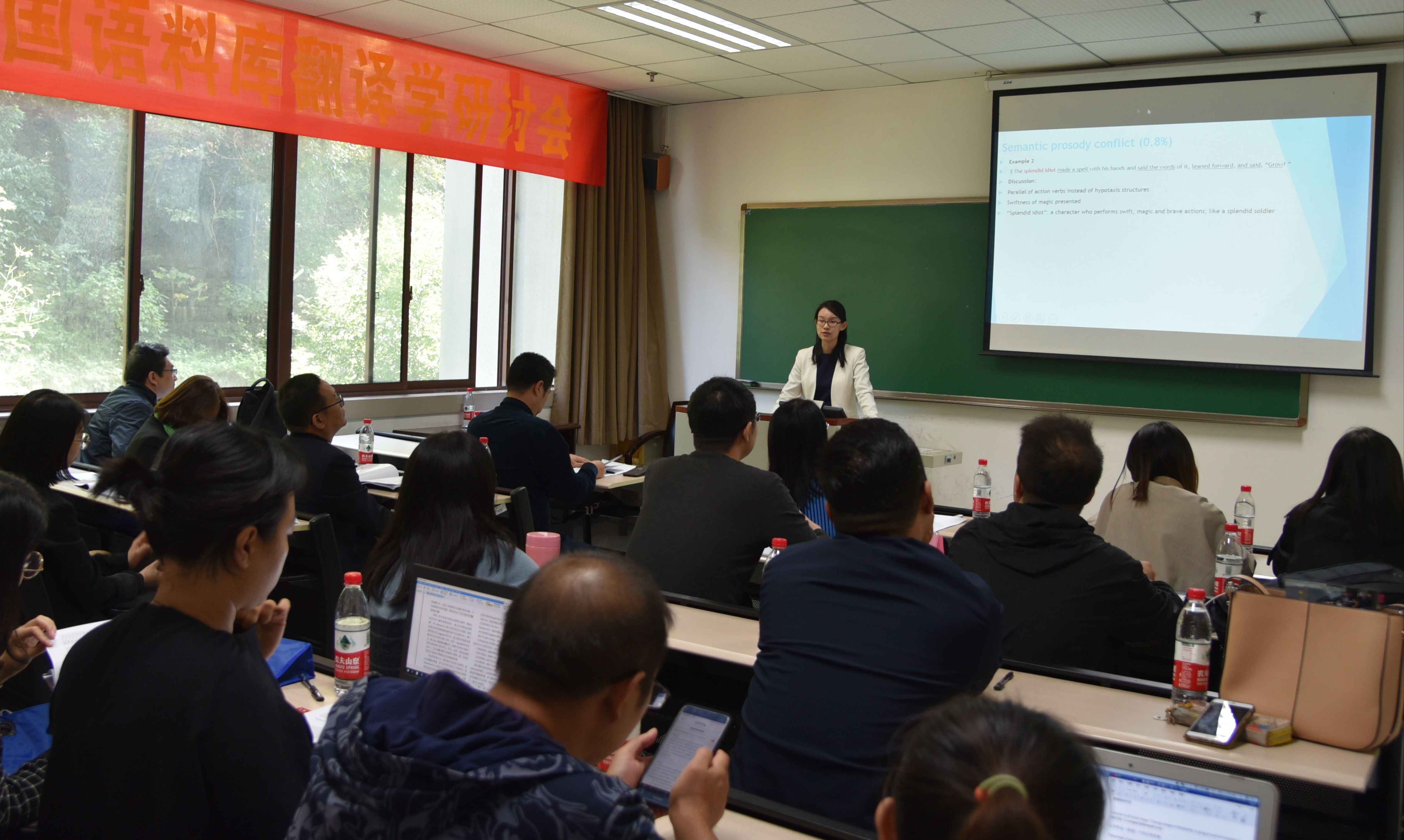 19日下午,研讨会主题报告在外国语学院903学术报告厅拉开帷幕。夏云教授基于历时翻译语料库,考察虚义动词“进行”的使用情况;胡显耀教授用语料库考察了翻译汉语中“把”字句的杂合现象,并探索了现象背后的动因。茶歇之后,第五届全国语料库翻译学研讨会闭幕式隆重举行。河南大学刘泽权教授就分会场发言进行总结;秦洪武教授对本次研讨会做总结性发言,指出语料库翻译学正显示出其旺盛的生命力,越来越多的年轻研究者正涌入该领域。语料库翻译研究也从以前的描写性研究逐渐走向阐释性研究,努力探索现象背后的原因,预示语料库翻译学的发展前景。最后胡显耀教授致闭幕辞,并对本次与会的学者、代表及工作人员表示感谢。