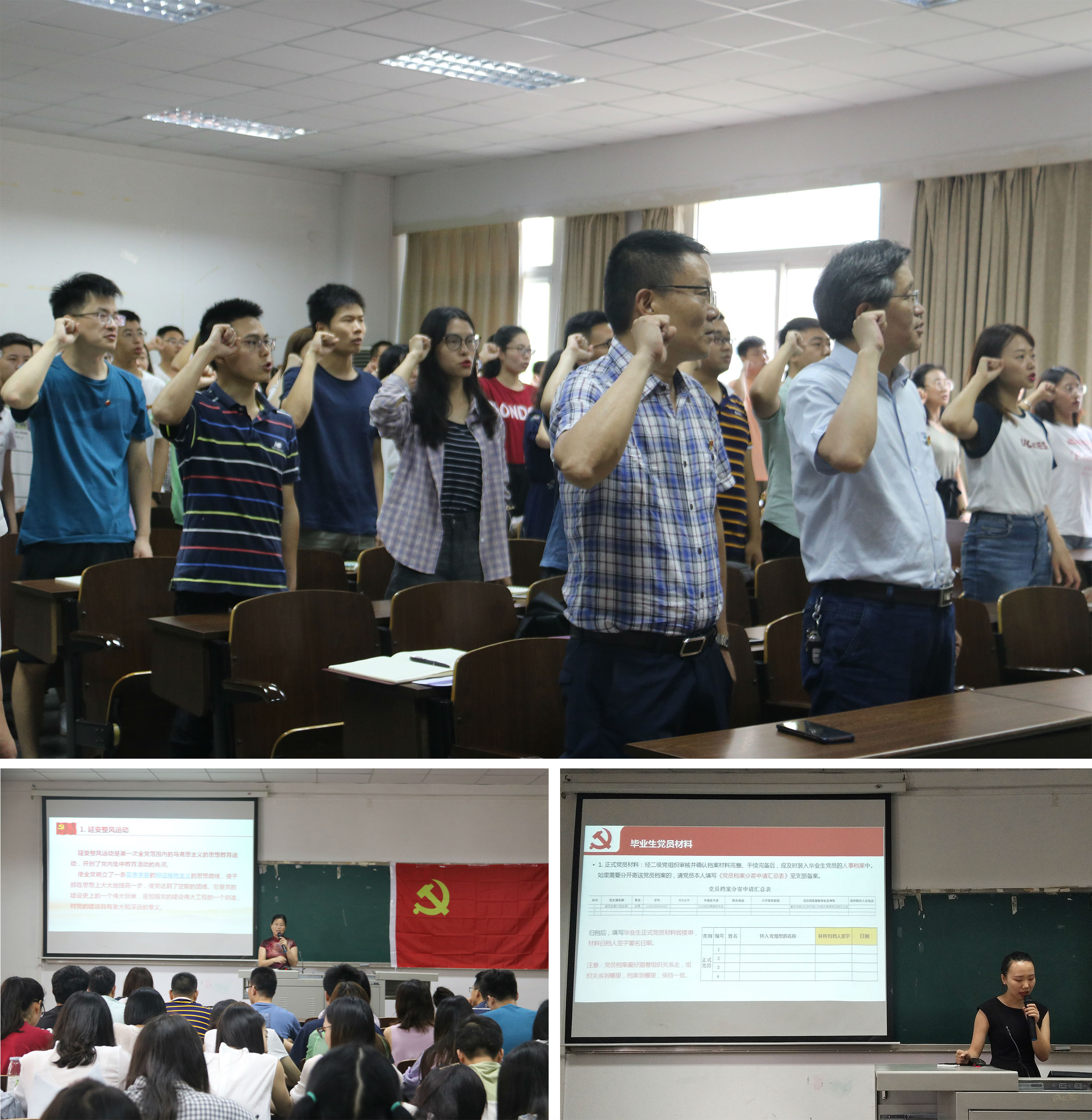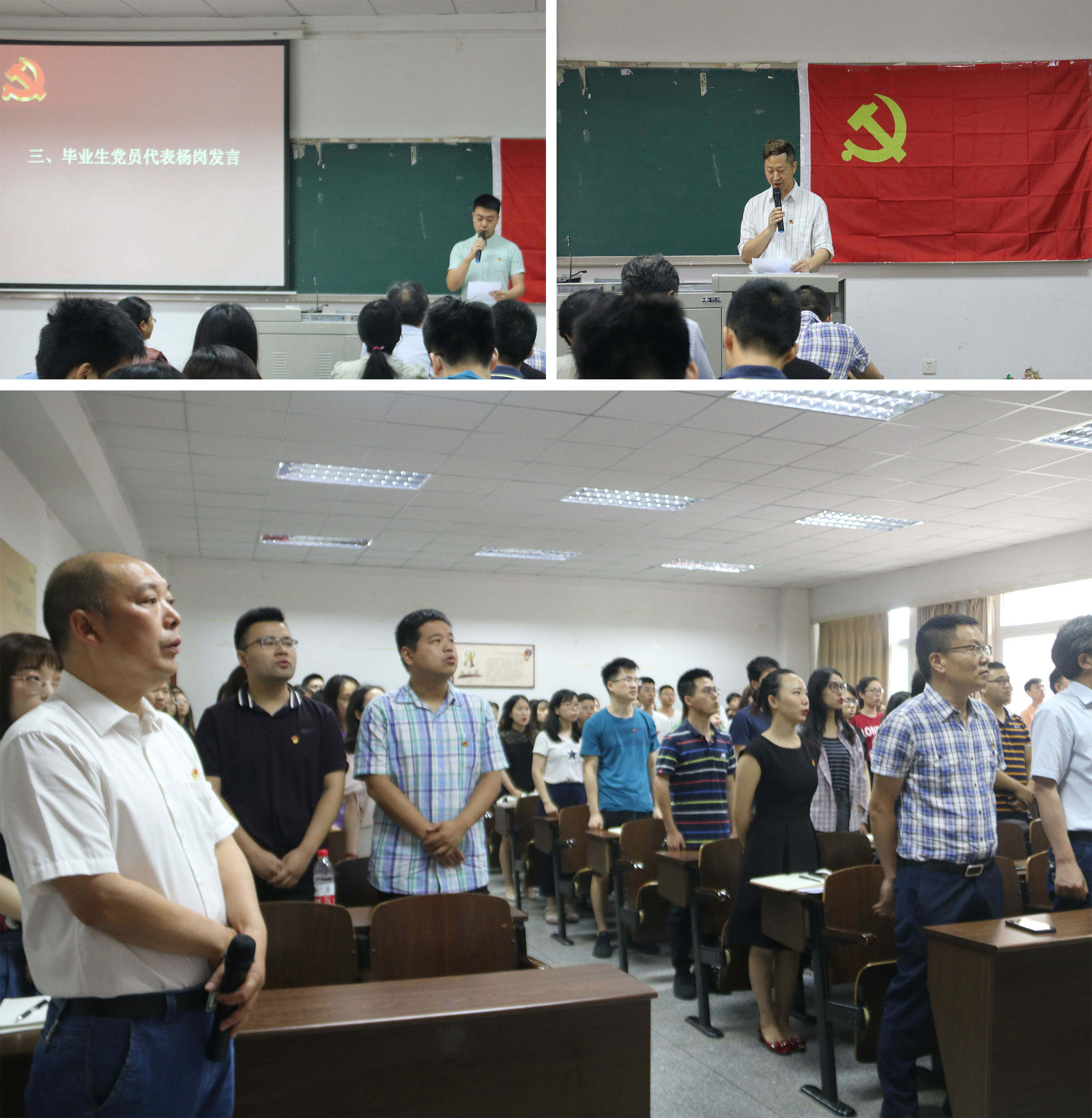 会议伊始,在唐荣发书记的带领下,全体党员齐唱国歌。歌毕,刘家琳老师带领大家重温入党誓词。随后,毕业生党员代表杨岗从思想品质、社会实践和学生工作等方面进行了总结发言,同时深切表达了对母校的不舍以及感谢。罗爱军老师以一首流沙河的诗作为贺礼,祝愿所有毕业生党员前程似锦。郑莉佳副书记从理论到实践为毕业生党员上了一节精彩的党课。她讲述了集体教育的历史、历程以及邮员王顺友的先进事例等方面内容,叮嘱毕业生党员在今后的生活及工作中“不忘初心,牢记使命”。在大会的最后阶段,张靖悦老师讲解了毕业生党组织关系转接相关注意事项并进行答疑。大会在全体党员嘹亮的国际歌歌声中缓缓落幕。