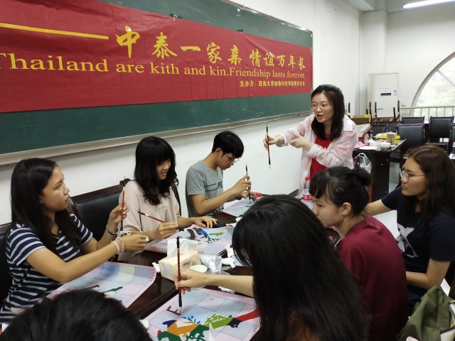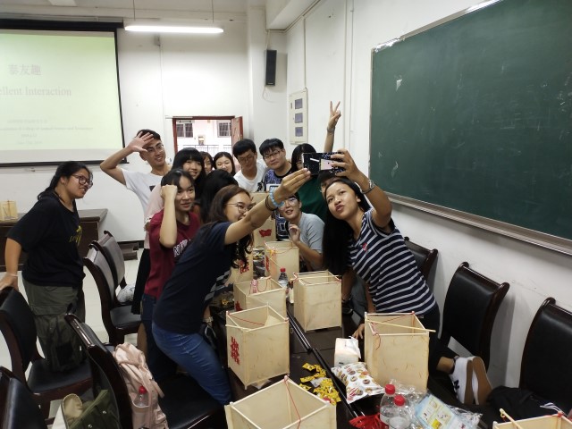 接下来的项目充满着浓郁的中国风,研会成员们准备了包饺子、画毛笔画、打中国结和做灯笼等具有中国特色的活动,让泰国交流生感受中国传统文化与习俗。在研会成员的指导下,交流生们纷纷动起手来学画画、包饺子、打中国结。在大家共同的努力下,桌子上满是中国“年货”,留学生们在感受的快乐同时,也感叹中国文化的博大精深。随后,大家一起品尝亲手制作的饺子,饺子的美味飘香教室。