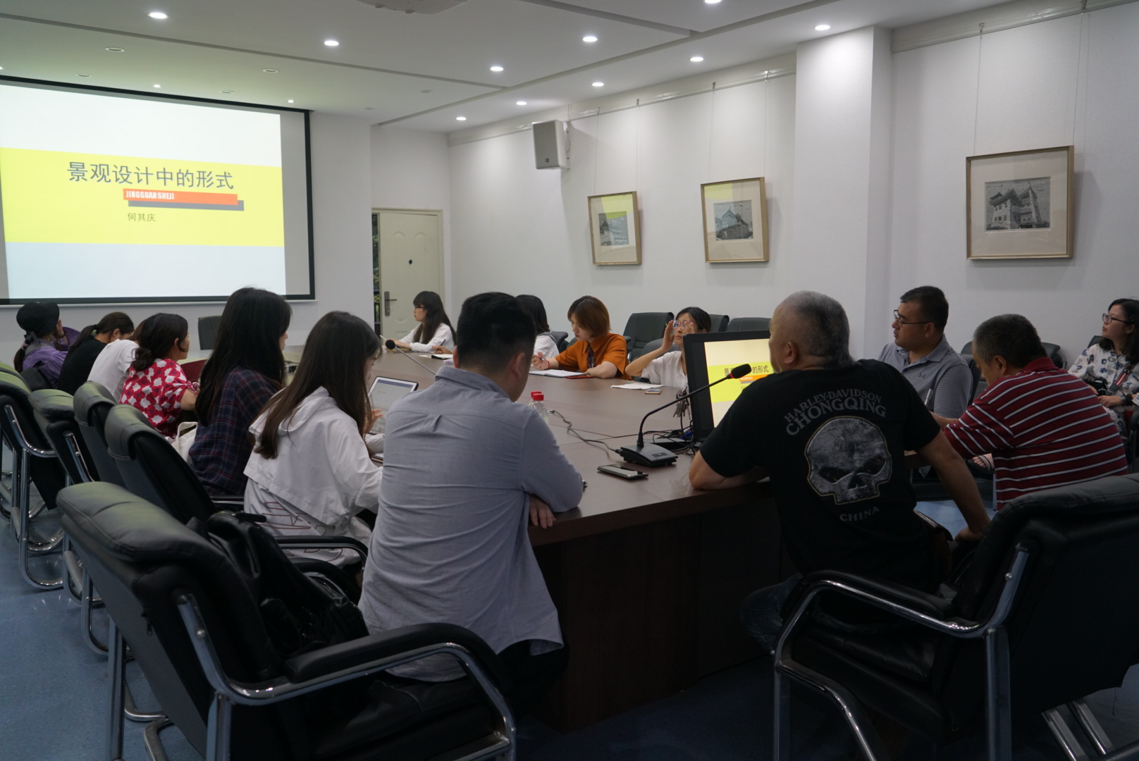 活动伊始,何其庆老师向同学们展示了风格各异的景观图片,并结合生活实际对景观设计中形式的概念及其功能进行了生动有趣的介绍。他指出,形式是设计者与使用者进行交流的特殊语言体系,它具有三个层面的功能:一是视域范畴上的形、色、量、质;二是新式美上的感官愉悦;三是心理与文化上的唤起。在何教授的讲解下,同学们既欣赏了不同建筑的形式美,也领会到景观设计中独具特色的艺术讲究。