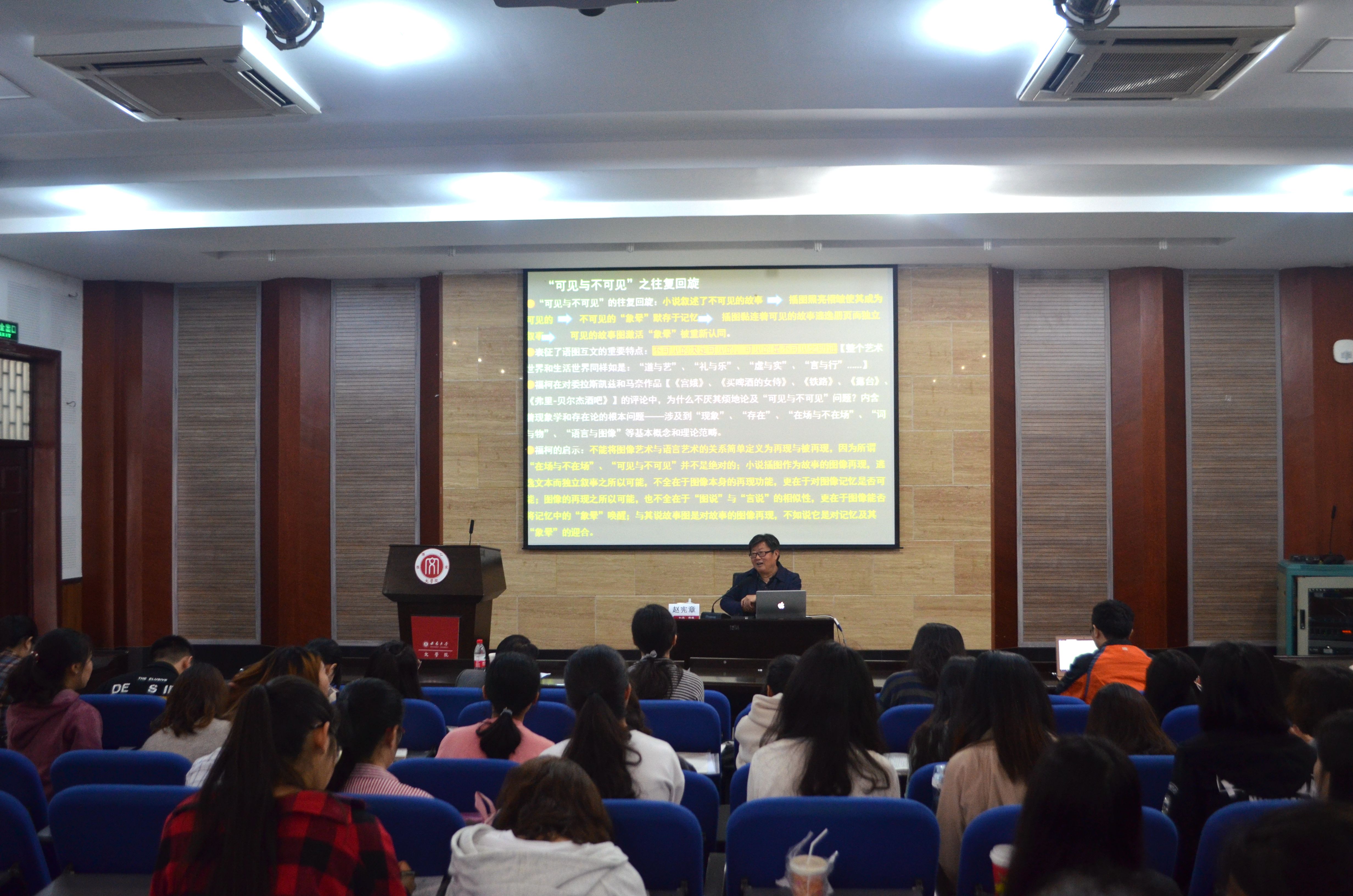 5月29日上午9点,中国文艺理论学会副会长、南京大学文艺学赵宪章教授做客文学院名师讲坛,带来了题为“小说插图:叙事的折叠与明见”的讲座,讲座由文学院肖伟胜教授主持,文学院部分教师代表及百余名同学参加了讲座。