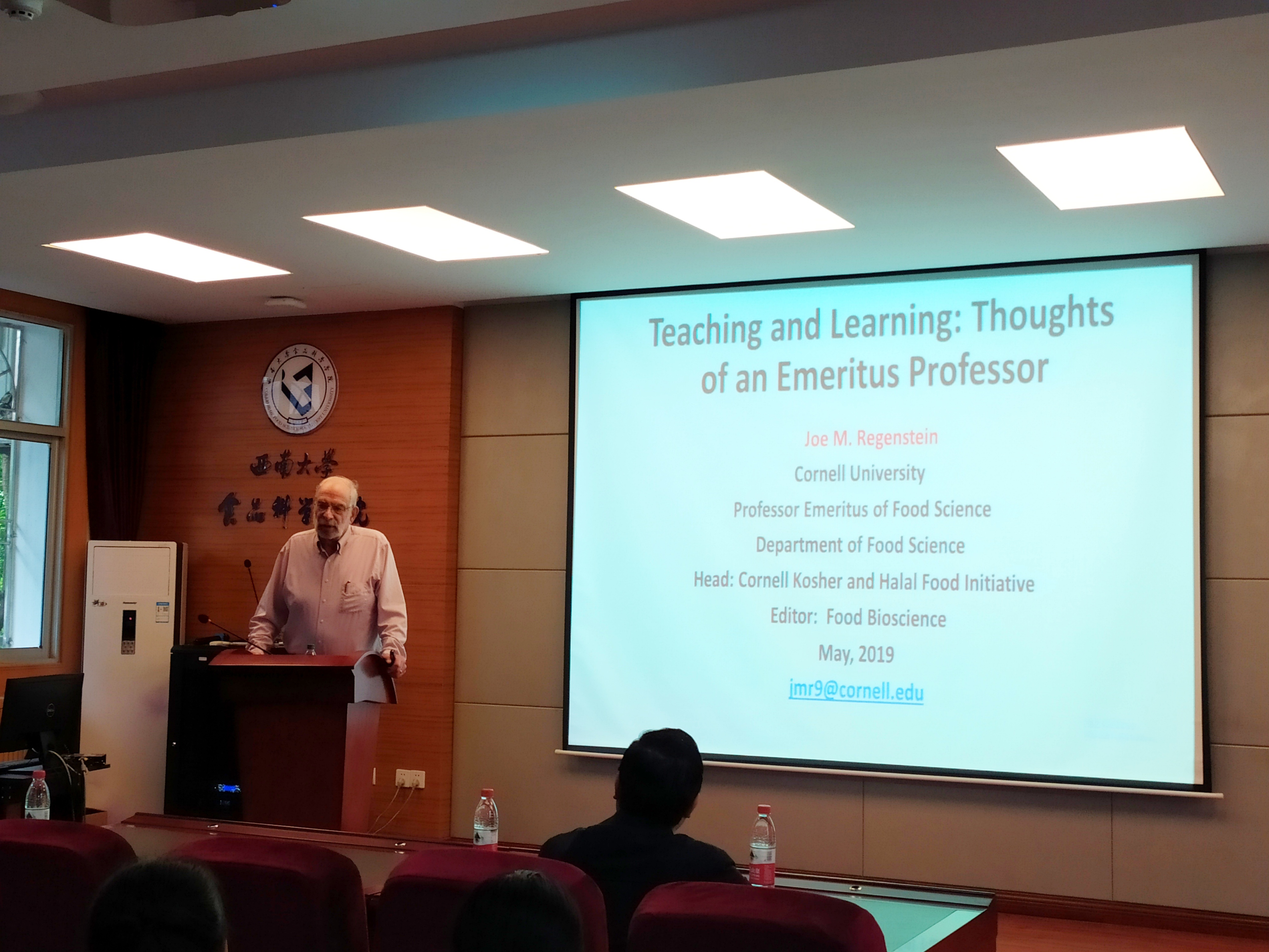 5月11日上午9点,康奈尔大学Joe Mac Regenstein教授在食品科学学院39教215报告厅作题为“关于食品专业的教与学”的报告。Joe Mac Regenstein教授为康奈尔大学食品科学系教授,康奈尔大学兽医学学院人口医学与诊断科学系客座教授,堪萨斯州立大学食品科学系客座教授,食品生物科学的合作主编,研究的重点为肉类食品以及家禽和鱼类加工废物的副产品回收问题。李洪军教授出席报告会,学院部分师生代表参加。