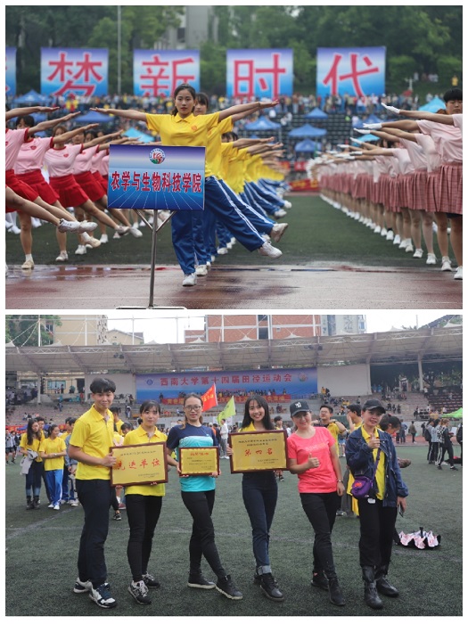 4月20日上午,闭幕式如期举行,教职工组与学生组以饱满的精神状态进行了广播体操的比拼,一前一后的动作刚毅柔美、充满热情。每一个转体、下蹲都是运动场上亮丽的风景线。紧接着,学校领导对本次运动会进行了总结性发言,并为获奖单位与个人颁发了奖牌。在建国70周年与建校113周年之际,农生学子用赛道上飒爽的英姿为之庆祝。这届运功会展现了农生院的努力拼搏、团结友爱的精神面貌,也很好的诠释了体育竞技精神。