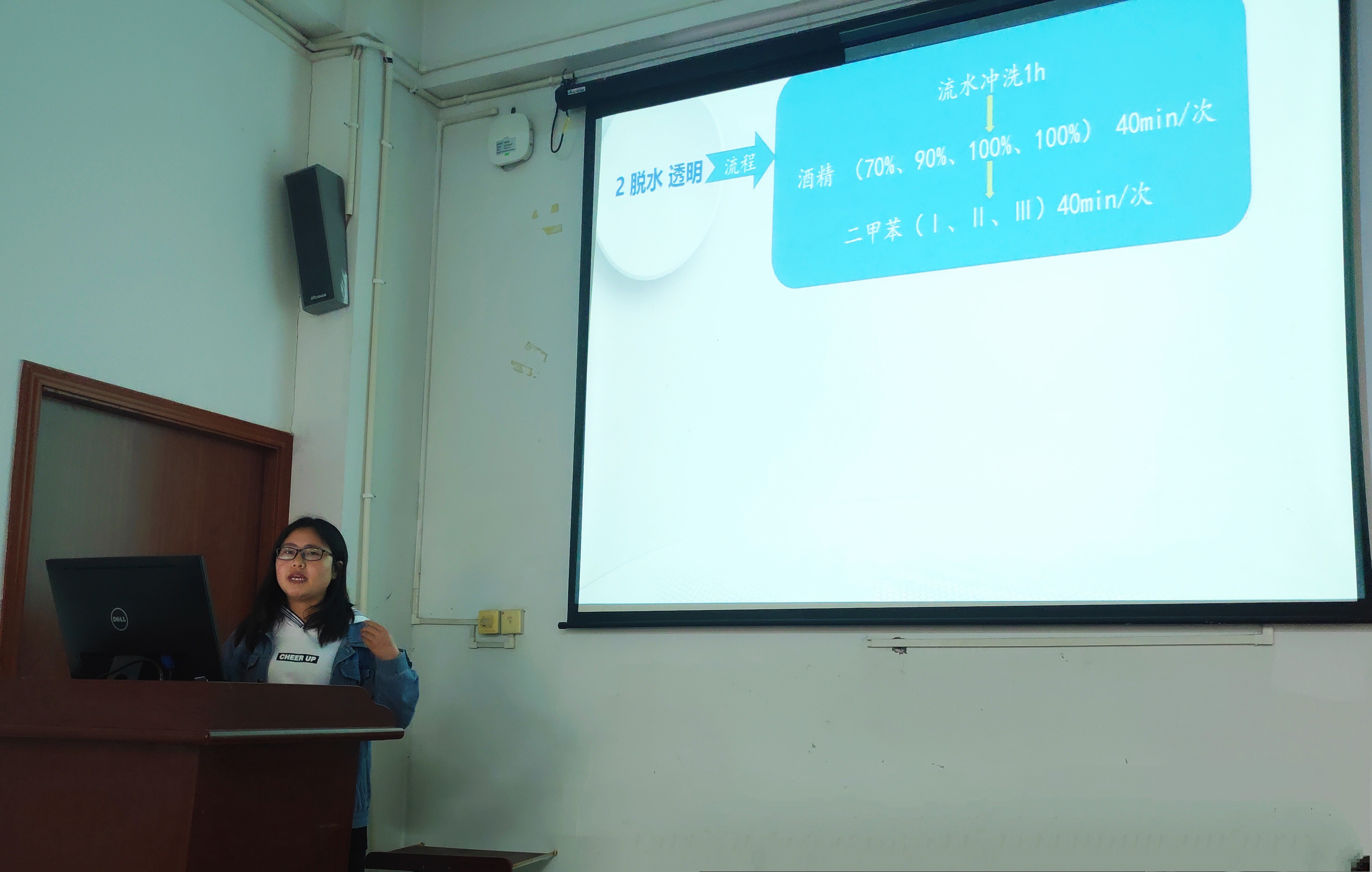 第二位报告人是来自2017级细胞生物学的硕士研究生张梅,她用幻灯片向同学们详细讲解了H&E切片制作流程,随后又通过一张张红蓝相间的切片的展示,让同学们领略微观世界的风采。