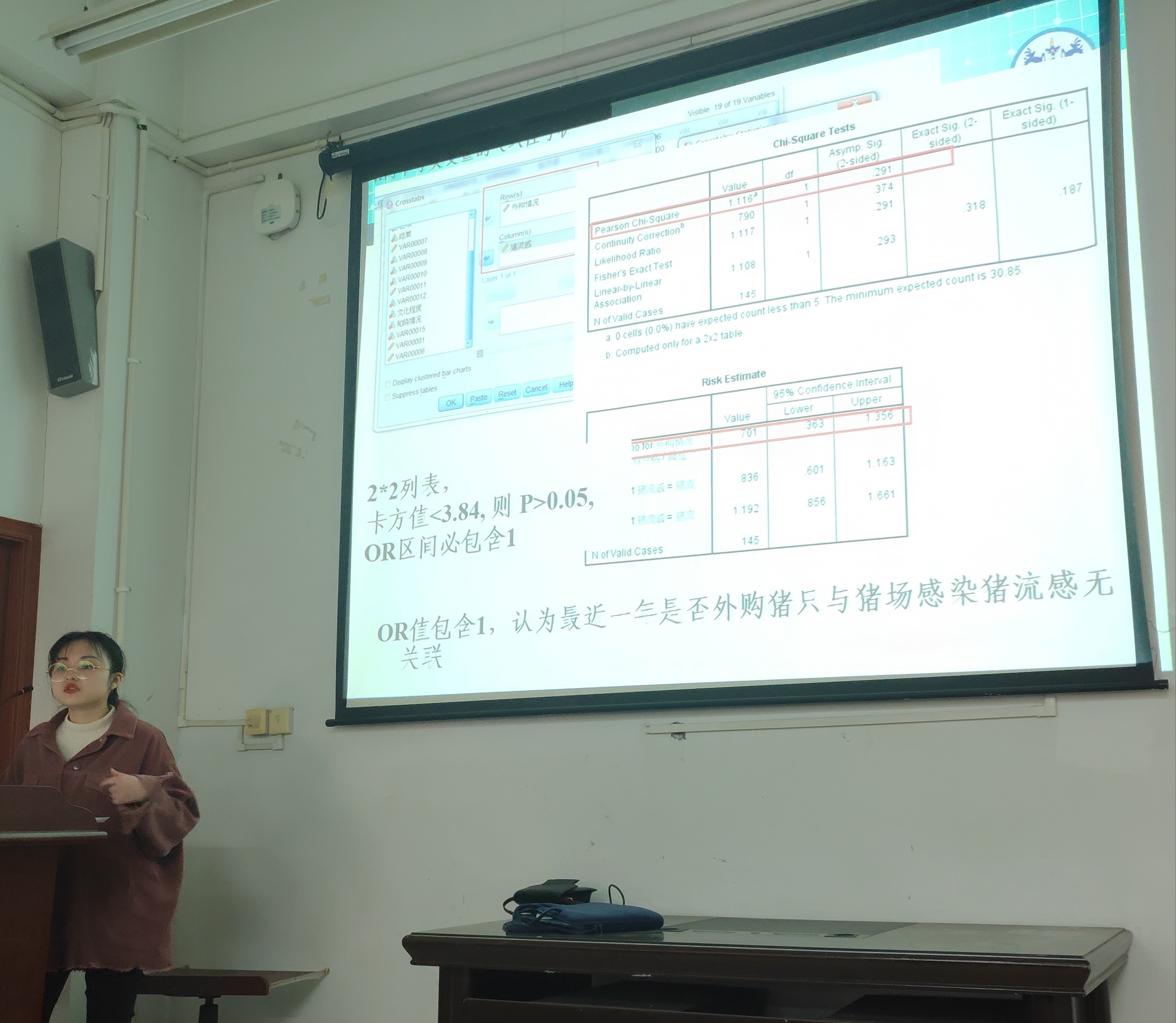 第一位上台讲演的是来自于2017级预防兽医学的硕士陈婷婷,她向同学们介绍了如何使用SPSS软件处理、分析实验数据等,并通过具体数据进行了演示,帮助同学们提升运用SPSS数据分析软件的能力。