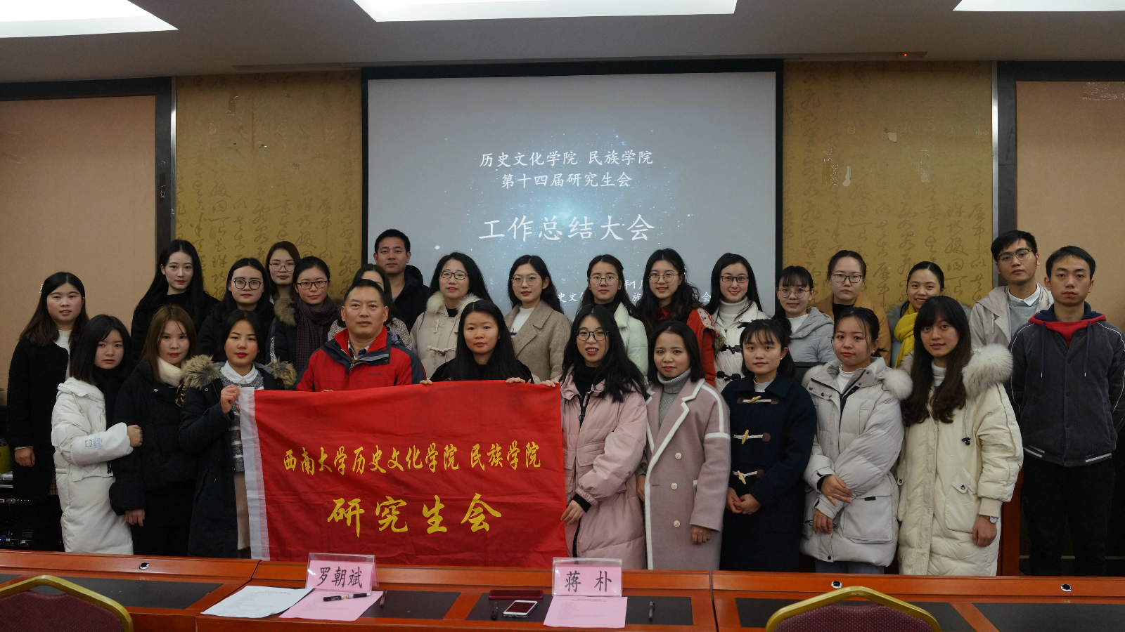1月4日上午8点30分,历史文化学院 民族学院研究生会在荟文楼七楼学术报告厅举行了2018年研究生会年度工作总结大会。出席大会的有学院党委副书记罗朝斌、研究生辅导员蒋朴和第十四届研究生会所有成员。