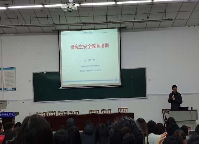 为落实国务院安委会办公室召开的高等学校实验室安全管理工作视频会议精神,吸取北京交通大学实验室爆炸事故教训,加强研究生实验室安全教育管理,物理科学与技术学院于2019年1月9日下午在大阶梯教室面向全体研究生开展了实验室安全教育培训,培训会由研究生辅导员熊中碧老师主持,硕士生导师、分管安全管理的院长助理赵建伟老师主讲。