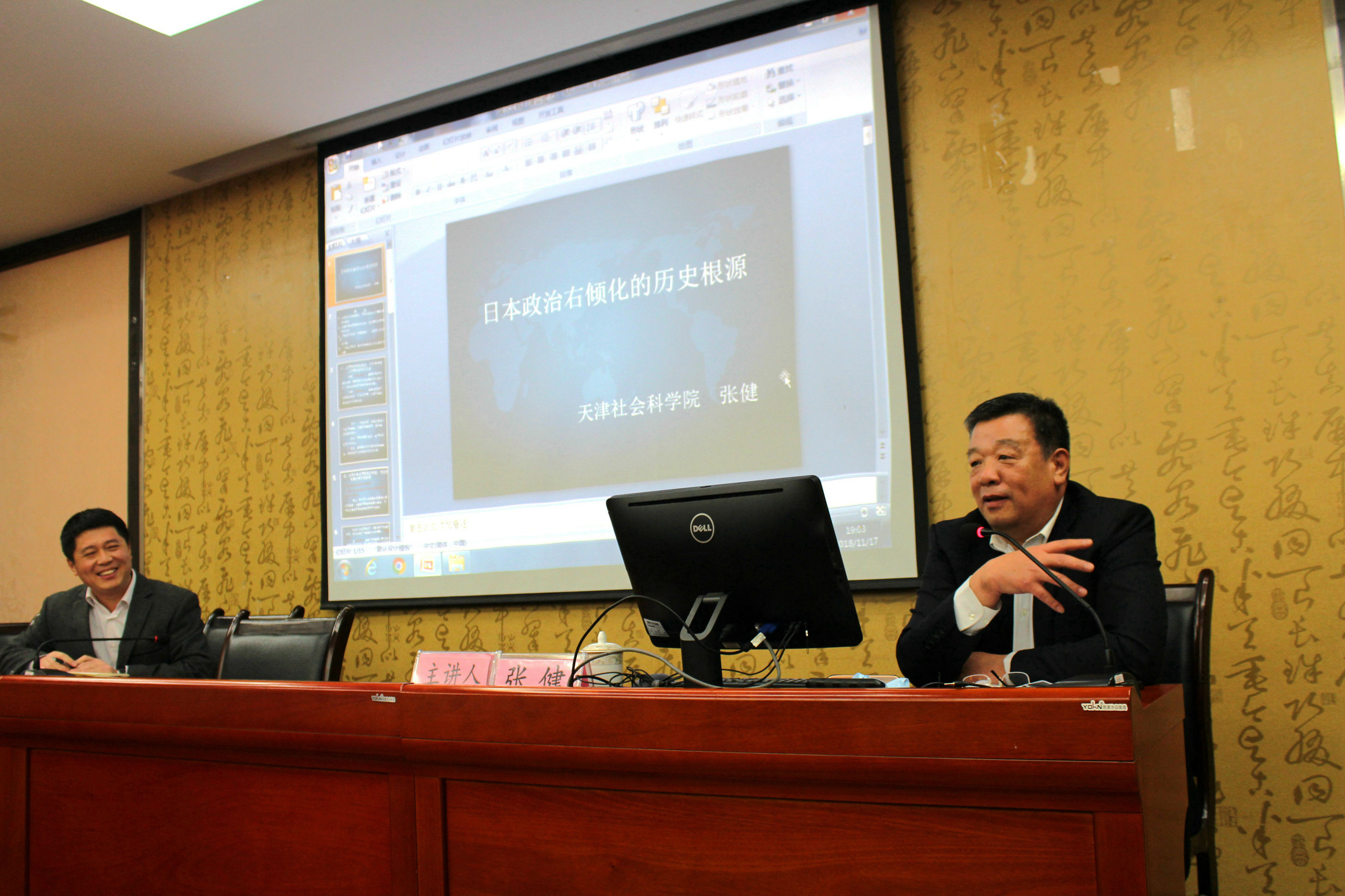 11月17号晚上7点,由历史文化学院民族学院主办的“日本政治右倾化的历史根源”讲座在荟文楼七楼学术报告厅顺利举办,讲座由历史文化学院民族学院王勇副教授主持,有幸邀请到了天津社会科学院研究员张健教授作为本次讲座的主讲人。部分老师以及研一全体学生参加了本次讲座。