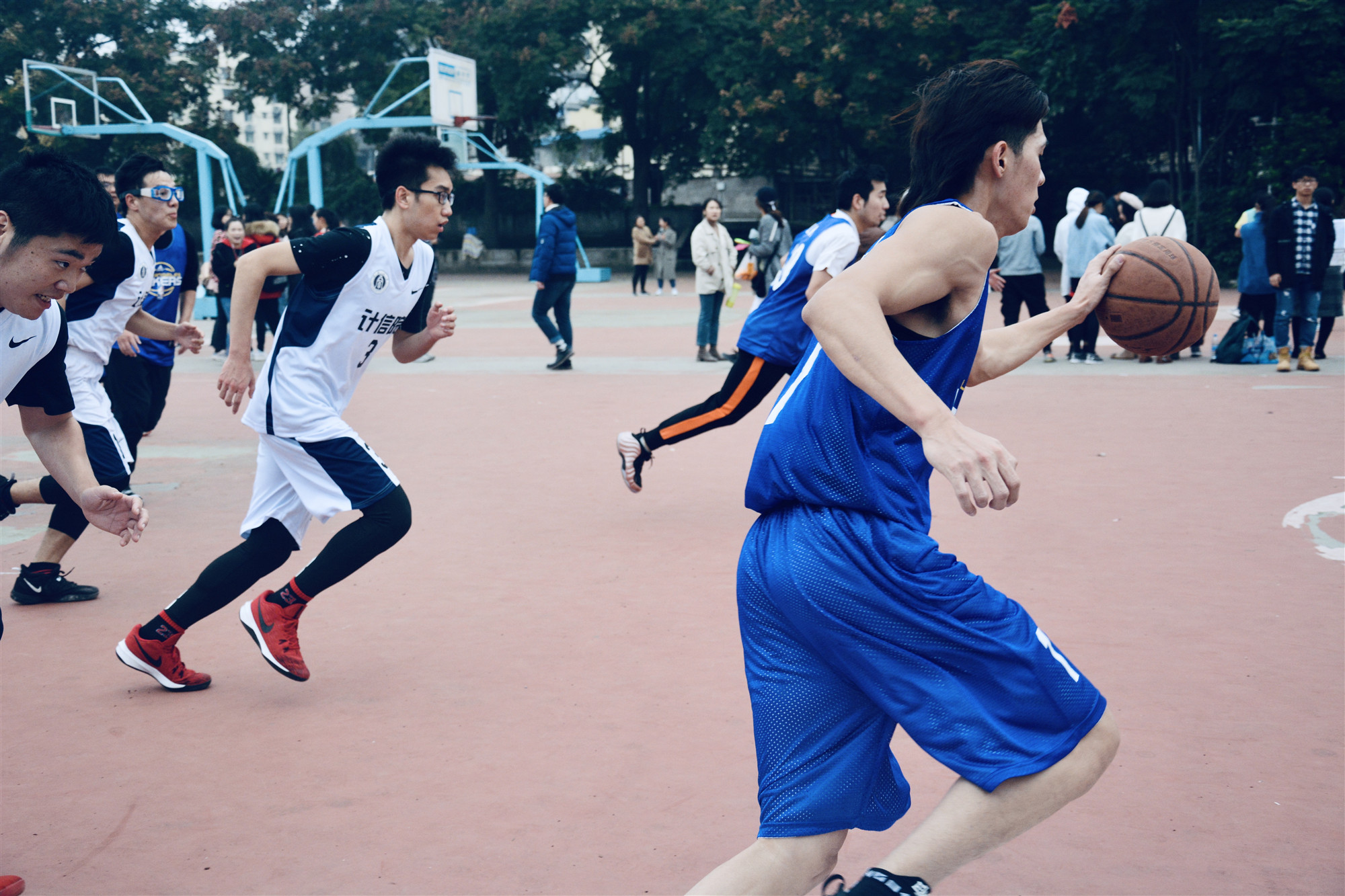 换场结束后比赛进入下半场,计信院加快进攻速度,对新传篮球队实行包围战术连进8分。新传篮球队千喆同学在关键时刻投进一个三分球,缩小了比分差距。但后来由于新传篮球队替补队员过少,队员开始体力不支。计信篮球队继续乘胜追击,比赛最终结果 37:49,计信篮球队获胜。
