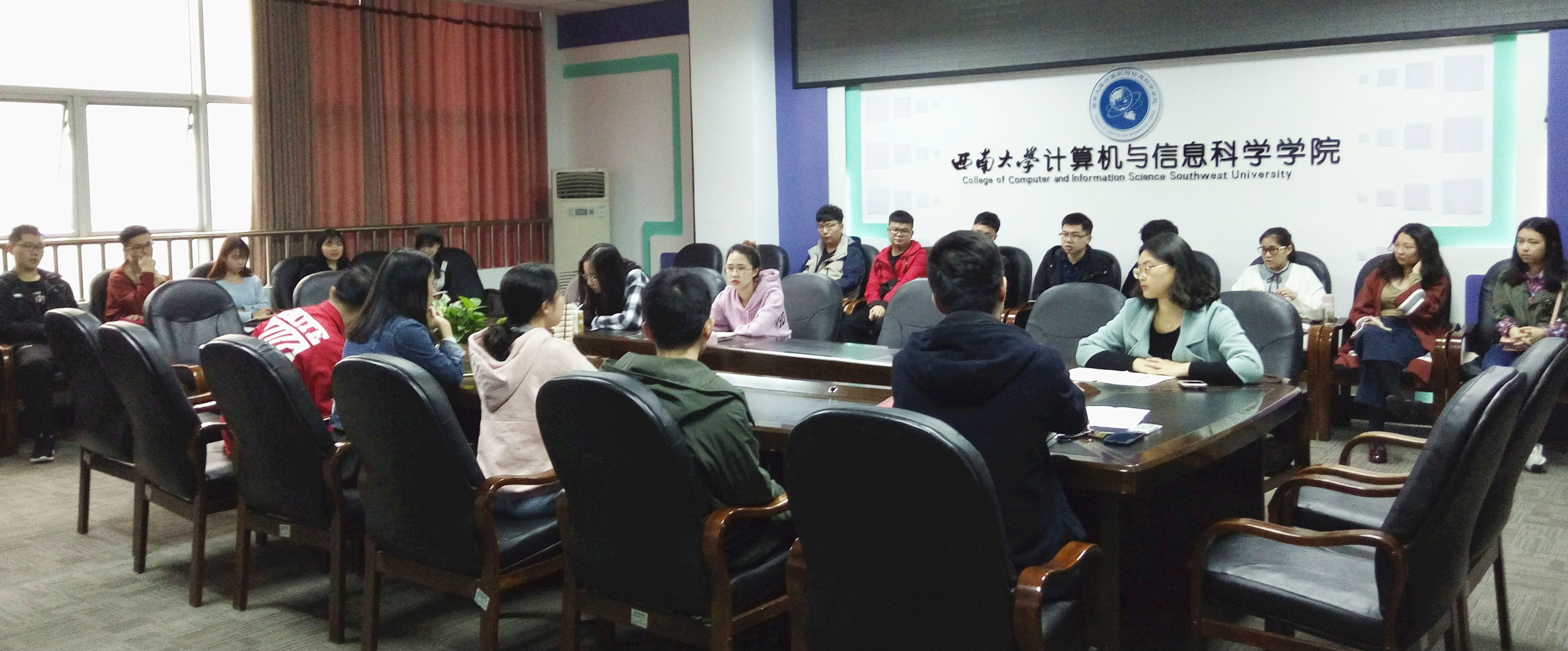 10月26日,计算机与信息科学学院研究生会新老生经验交流会在25教成功举行。第十二届团总支研究生会主要干部及新一届研究生会全体成员参加了本次新老生交流会,交流会由研究生会主席谢天瀛主持。本次交流会旨在加强研会新成员对研会工作的了解以及促进成员间的沟通交流。