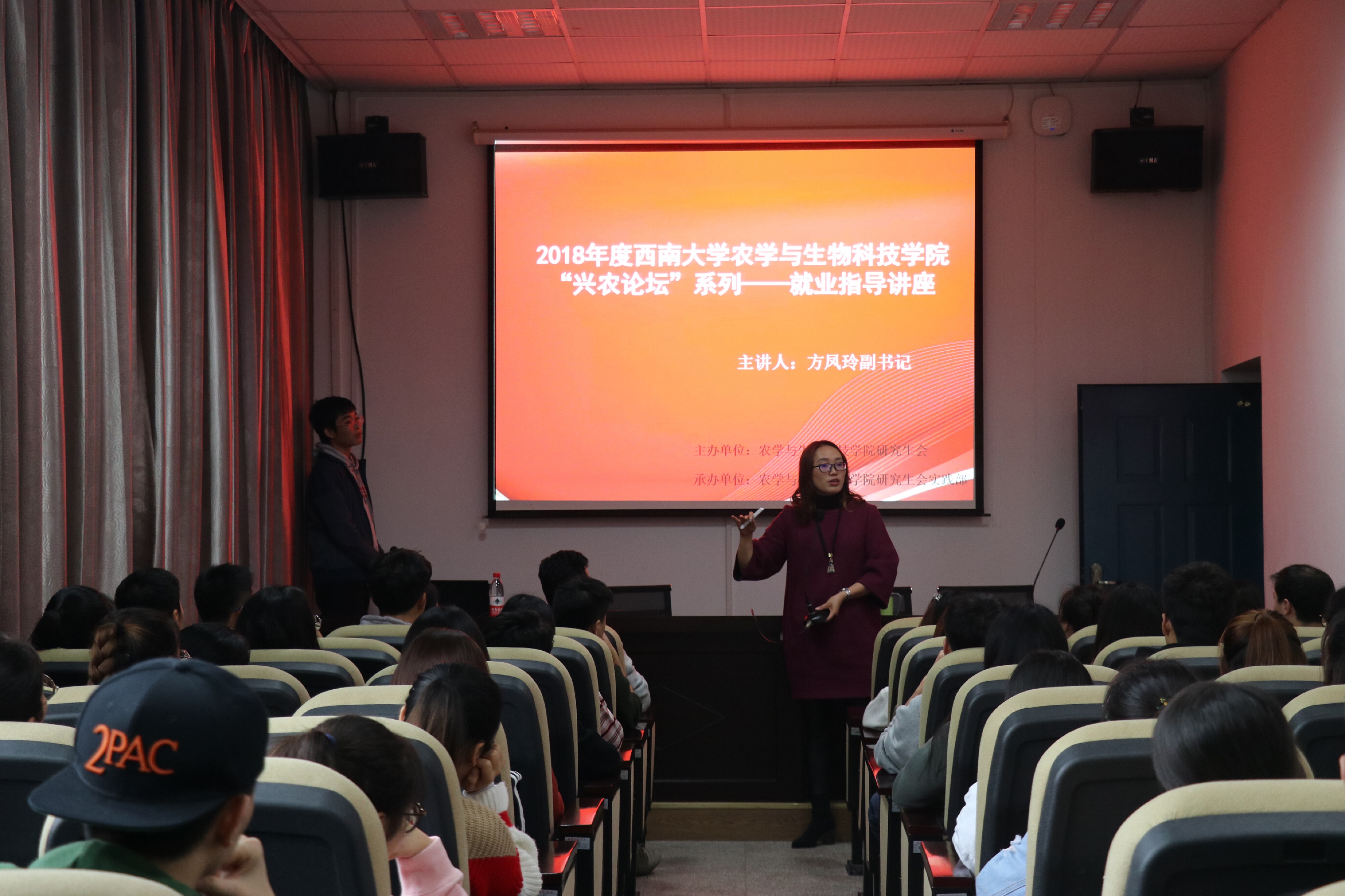 为了加强对学生就业方面的指导与帮助,使同学们在当前严峻的就业形势下能安之若素、充分发挥自身优势。10月25日下午3:00,由农学与生物科技学院研究生会主办的兴农论坛之就业指导讲座在棉研楼501室成功举行。讲座特邀农生院党委副书记方凤玲主讲,农生院在校研究生参加了本次讲座。