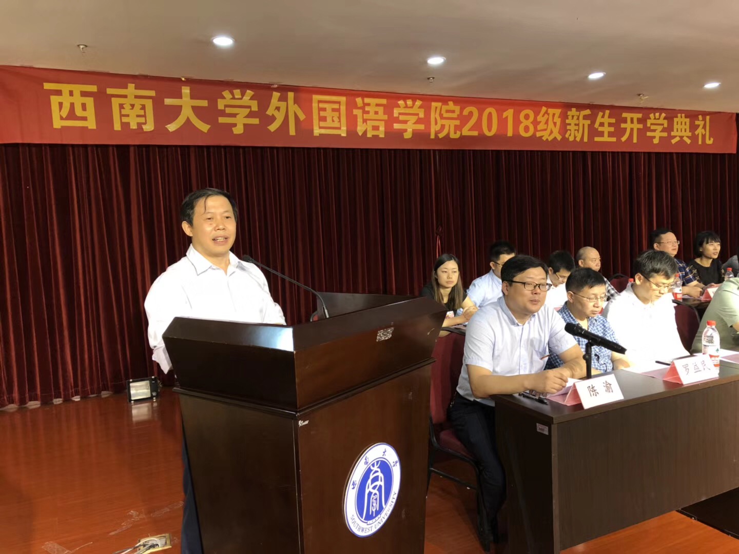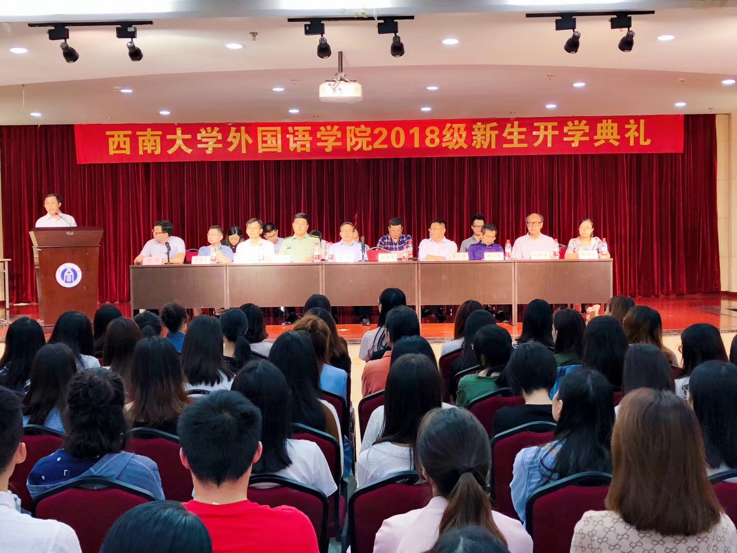 典礼在庄严的国歌声中拉开序幕。外国语学院党委书记、博士生导师文旭教授致欢迎辞。文书记首先代表学院全体师生员工,对2018级新同学的加入表示欢迎,随后,文书记简要介绍了学院的基本情况,同时对同学们提出了五点希望:第一,要有理想信念;第二,要有感恩之心;第三,要有宽容之心;第四,要有智慧的头脑;第五,要有“拼命三郎”的干劲!