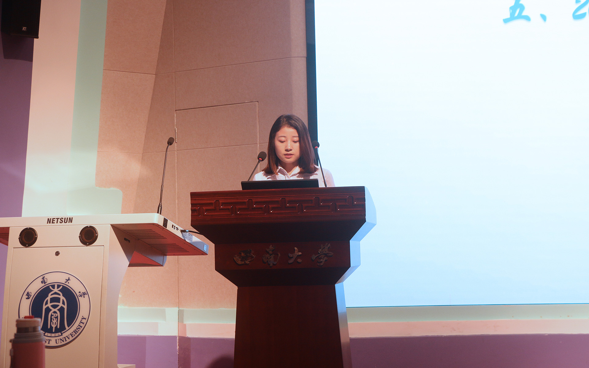 接着,2016级研究生老生代表何悠发言,谈及了自身研究生学习和生活的体会,提醒师弟师妹们要认识本科教育与硕士教育的不同,培养创新意识和能力;要主动热情地投入学习和科研,多参加学术活动和讲座,多涉猎跨学科的知识;最后在保证正常学习的基础上做到自身全面发展,为今后求职简历中增砖添瓦,更为完善自己做好准备。典礼的最后,夏浩然同学代表2018级研究生新生发言,他倡导大家在科研和生活中铭记“做人做事做学问,尽心尽力尽责任”的院训,在未来的研究生学习生活做到学而深思,思而后得。