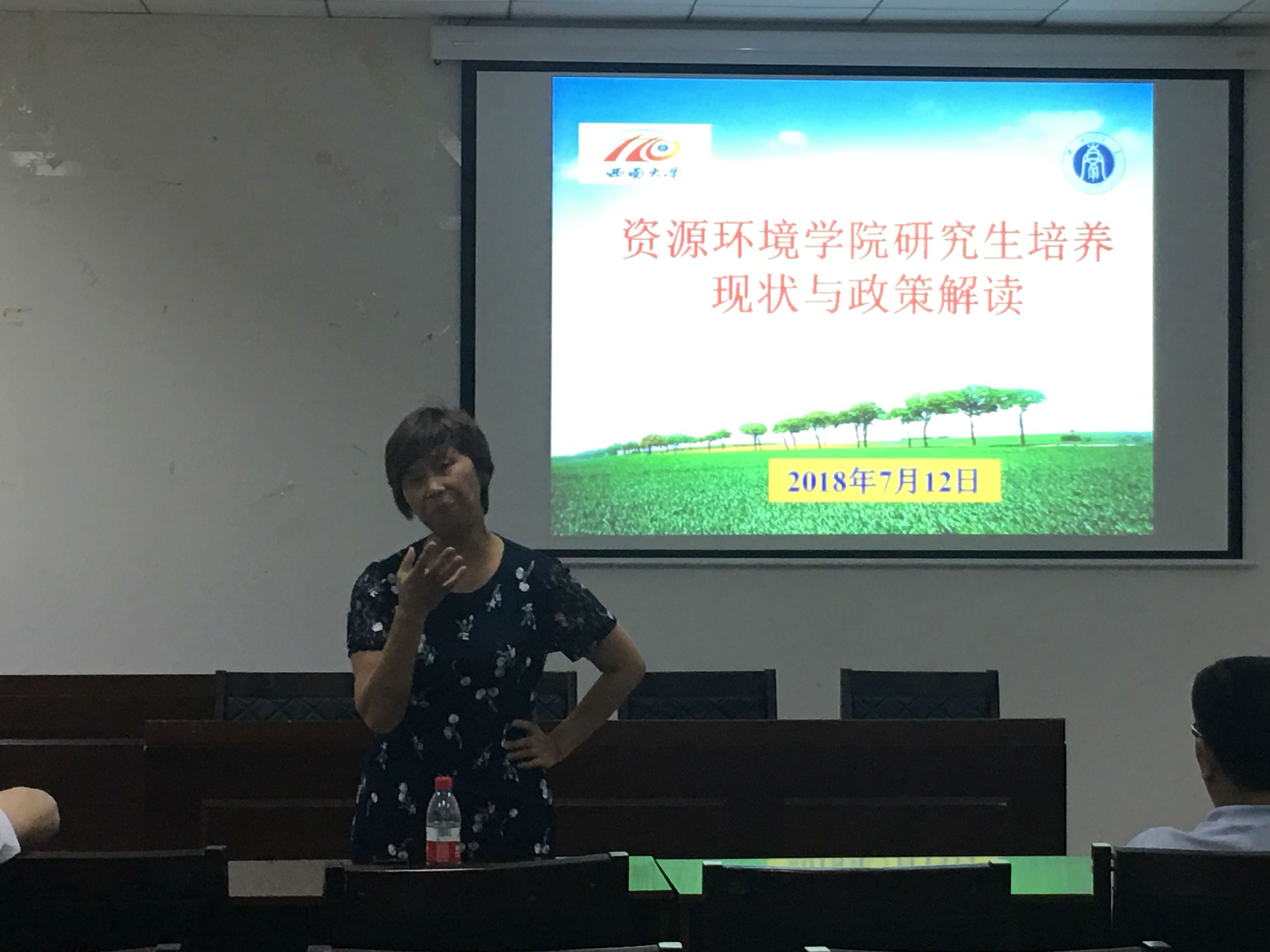 倪院长宣讲的主要内容包括导师师德师风、招生专业与科研平台、导师队伍与招生规模、学院研究生培养相关规定与未来发展方向等五个方面。首先对《关于全面落实研究生导师立德树人职责的意见》做出解读,提出师德师风七条红线,希望各位导师谨记。随后整体介绍了学院招生专业、科研平台、师资队伍与招生规模现状,并发布2019年招生办法、学位论文答辩学术成果基本条件、学位论文盲评和抽检结果管理办法。最后提出学院发展方向,将要努力建设以农业资源与环境学科为核心,建设融土壤学、植物营养学、环境科学、环境工程、林业科学、水土保持、水资源、土地资源为一体的特色鲜明的资源环境学科体系。