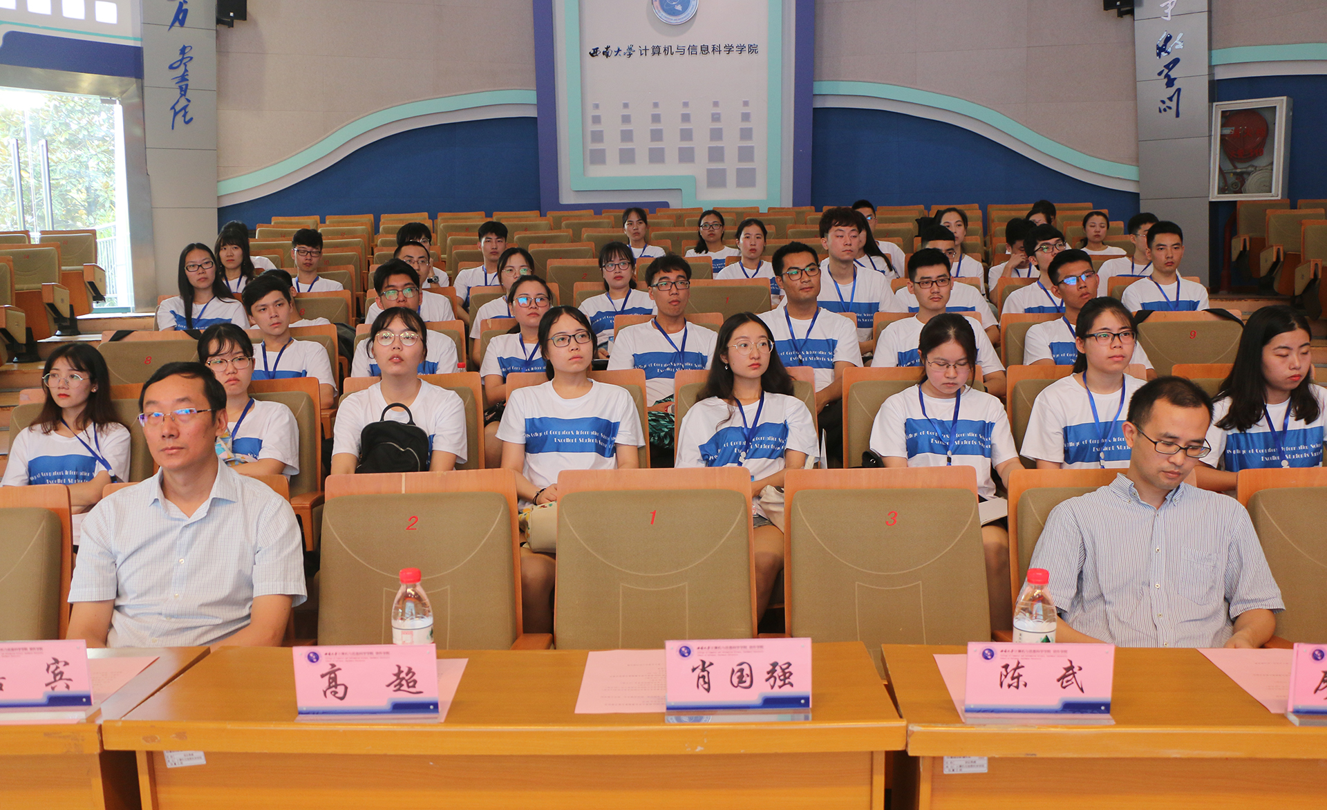 第一环节是学院院长肖国强教授致辞并就学校概况、计信院、研究生相关培养管理三个方面进行介绍。第二环节是导师代表廖建伟以及王峻老师进行发言,纷纷就自己实验室所做方向与成就等做出了简短介绍,并明确表达了对营员们来西大读书的期待。第三环节是营员代表西北工业大学付艺辉同学发言,表达了自己对于betway西汉姆联的热爱以及能在betway西汉姆联读书的希望。第四环节是老师和营员们的互动交流环节,同学们就数字图像处理方面、各位老师的研究方向、出国留学机会的一些方向、即将成立的大数据人工智能的师资力量、优秀毕业生毕业去向、人工智能是否有与绿色生态合作的产业、虚拟现实与增强现实等问题进行提问,老师们给营员们耐心一一讲解。互动环节之后,参与开营仪式的全体成员在报告厅门口合影留念。