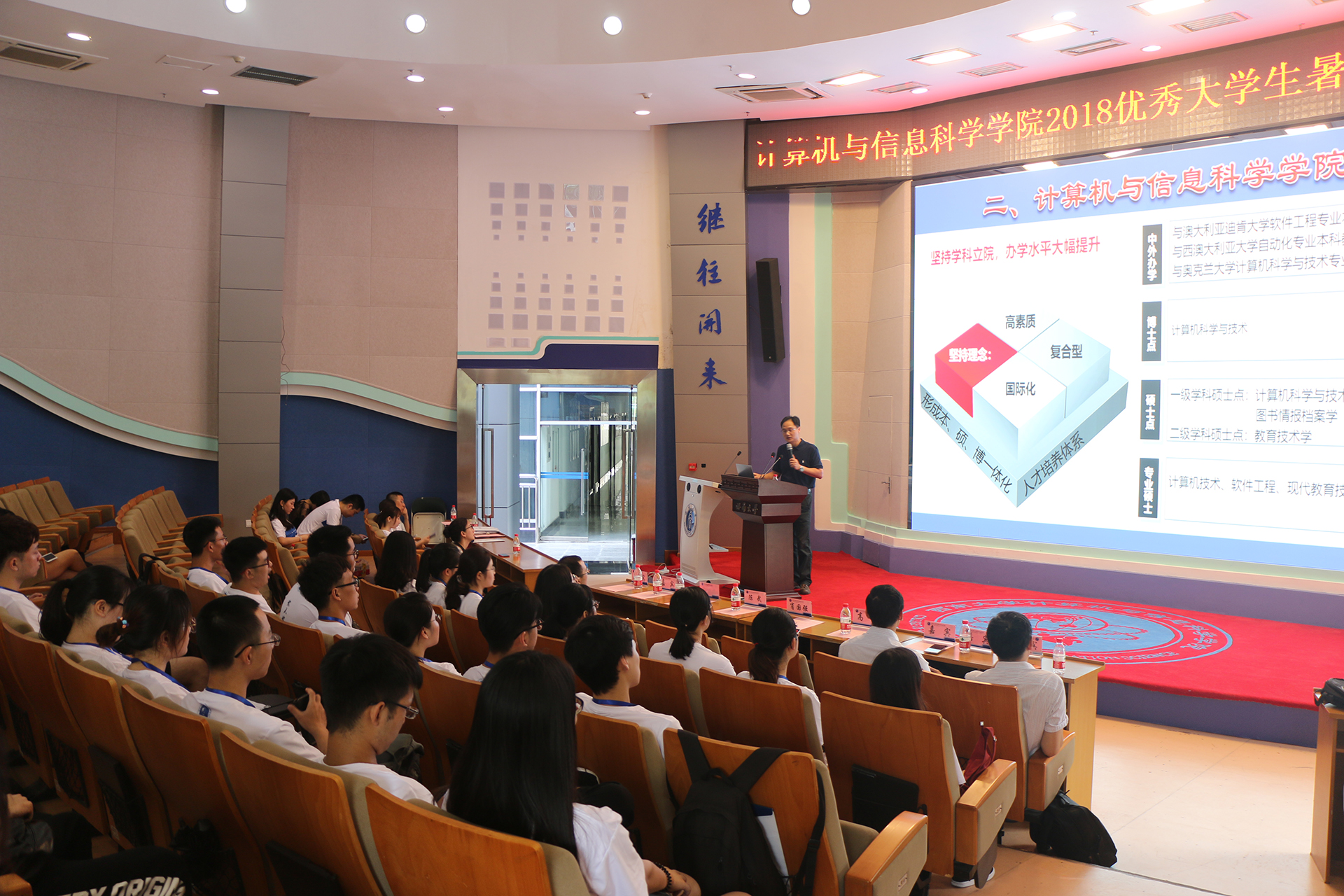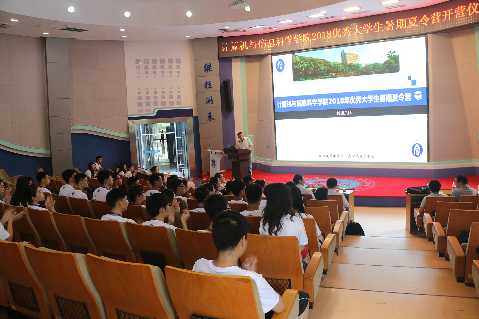 为推动学院学科发展,切实提升研究生招生质量,激发青年学生的学习热情以及研究兴趣,从而吸引更多的优秀生源。7月16日上午,计信院于25教一楼0114报告厅举行2018优秀大学生暑期夏令营开营仪式,参会人员有学院院长肖国强、副院长陈武、导师代表廖建伟、高超、邹显春、陈善雄、王峻、李娅、研究生辅导员张颖、研究生教学秘书、全体营员及志愿者,此次开营仪式由陈武副院长主持。