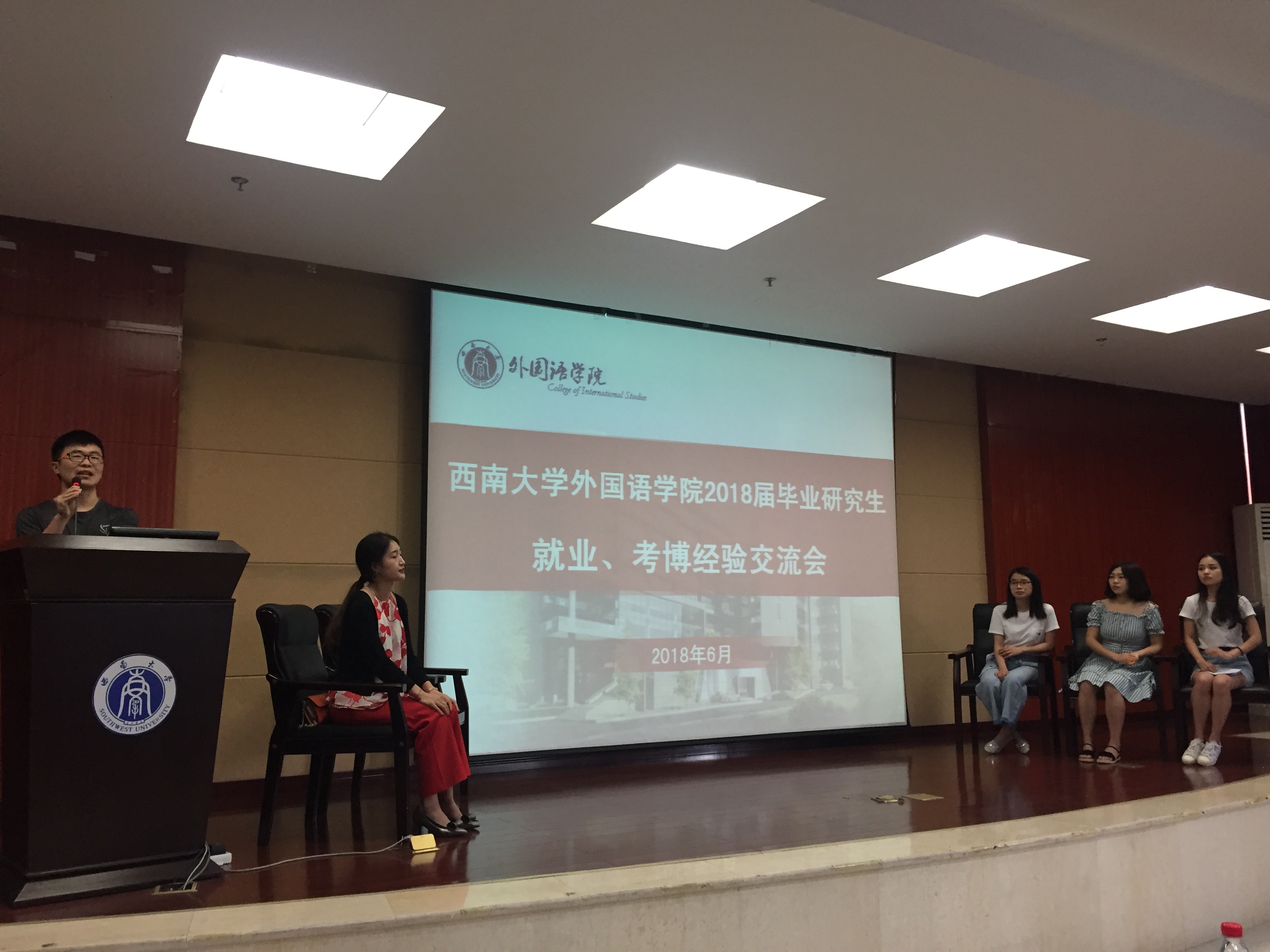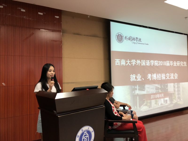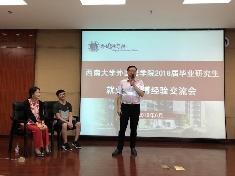 6月22日下午三点,外国语学院2018届毕业研究生就业、考博经验交流会在学院903报告厅举行,司卫国、宋春竹、付桢等五名学院2018届毕业研究生代表应邀出席,与2016级、2017级研究生交流就业、考博心得,学院党委副书记陈渝老师和研究生辅导员何炬老师也到场指导,交流会现场座无虚席,气氛热烈。
