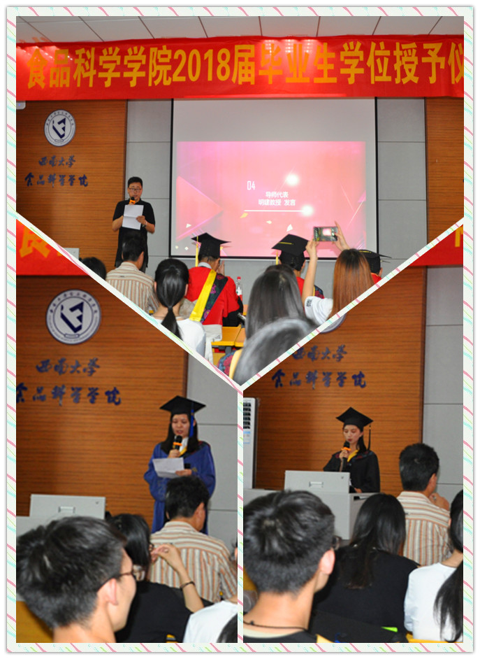 “不忘初心,坚持理想。毕业对你们来说,只是另一个新的起点,也会面临更多的选择,在前行的路上肯定会遇到各种困难,但一定不要放弃。”教师代表明建教授向即将离开学校步入社会的2018届毕业生们做了最后的嘱托,告诫同学们步入社会一定要“脚踏实地、充满自信”同时“心怀感激、学会分享”。随后,毕业研究生代表马小涵同学和本科生代表肖沁林同学分别发言对母校的培养表示感谢,郑重承诺必定不负食品科学学院老师们的谆谆教诲,勇往直前。