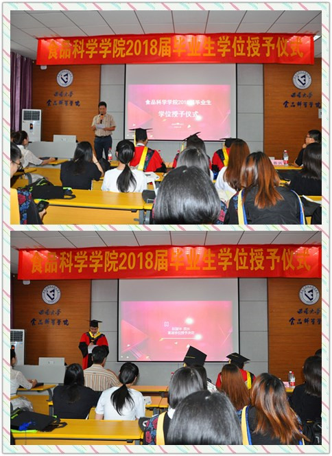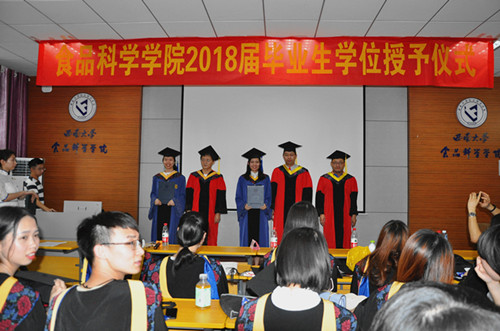 以梦为马,一路风华。6月26日下午,食品科学学院2018届毕业生学位授予仪式在39教312会议室隆重举行。本次学位授予仪式由食品科学学院党委书记周大明主持,食品科学学院院长赵国华教授、党委副书记刘秋艳、副院长张宇昊教授、研究生导师曾凡坤教授、明建教授以及毕业年级辅导员黄晔老师、胡孜老师出席,2018届毕业生及家长代表参加。