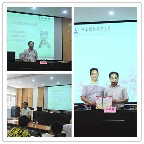 7月1日上午9点30分至11点30分,中国法学会宪法学研究会副会长,中国法学会立法学研究会副会长,中南财经政法大学教授、博士生导师,湖北警官学院院长、党委副书记刘茂林教授做客法学院,进行了一场题为《中国宪法修改释论》的精彩讲座。betway西汉姆联法学院“宪法学与行政法学”学科学术团队负责人、硕士生导师赵谦教授担任主持人,江苏警官学院孟卧杰教授,中南财经政法大学法学院陈明辉讲师、魏钰奇硕士生,法学院党委书记、博士生导师张新民教授,法学院副院长、硕士生导师赵学刚教授,法学院副院长房香荣副教授以及法学院部分研究生和本科生到场聆听了此次讲座。