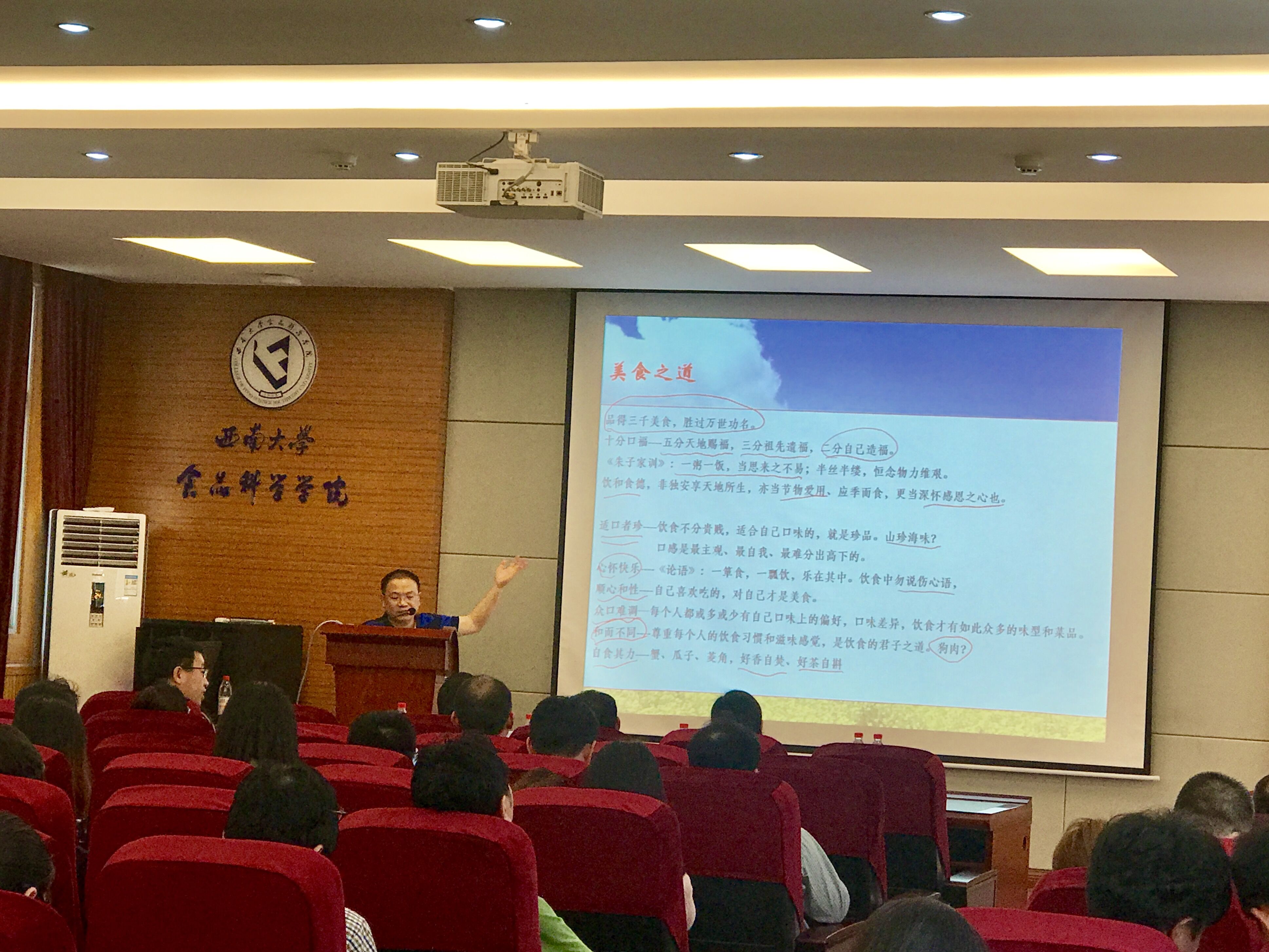 欧百钢处长首先以中国饮食文化发展脉络为主线,通过美食之道、美食历史与食材、美食之味等多方面为依托,生动详细地为大家讲解了自古以来随时代的变更饮食文化的形成、演变及发展,并表述了美食与社会、经济、科学、资源环境等多方面的联系。接下来,他表示要注重中华美食的国际推广,深入分析了中国美食专业学位设置的现状,以此为切入点强调学校在美食研究生的培养上要与科学研究相匹配,为社会输出具有科学理论知识和实际操作能力的食品美食专业高级人才。最后,欧百钢处长向在座师生提出切实期盼,希望我校食品科学学院根据自身学科优势和特点,为地方经济建设和中国美食专业做出实际贡献。