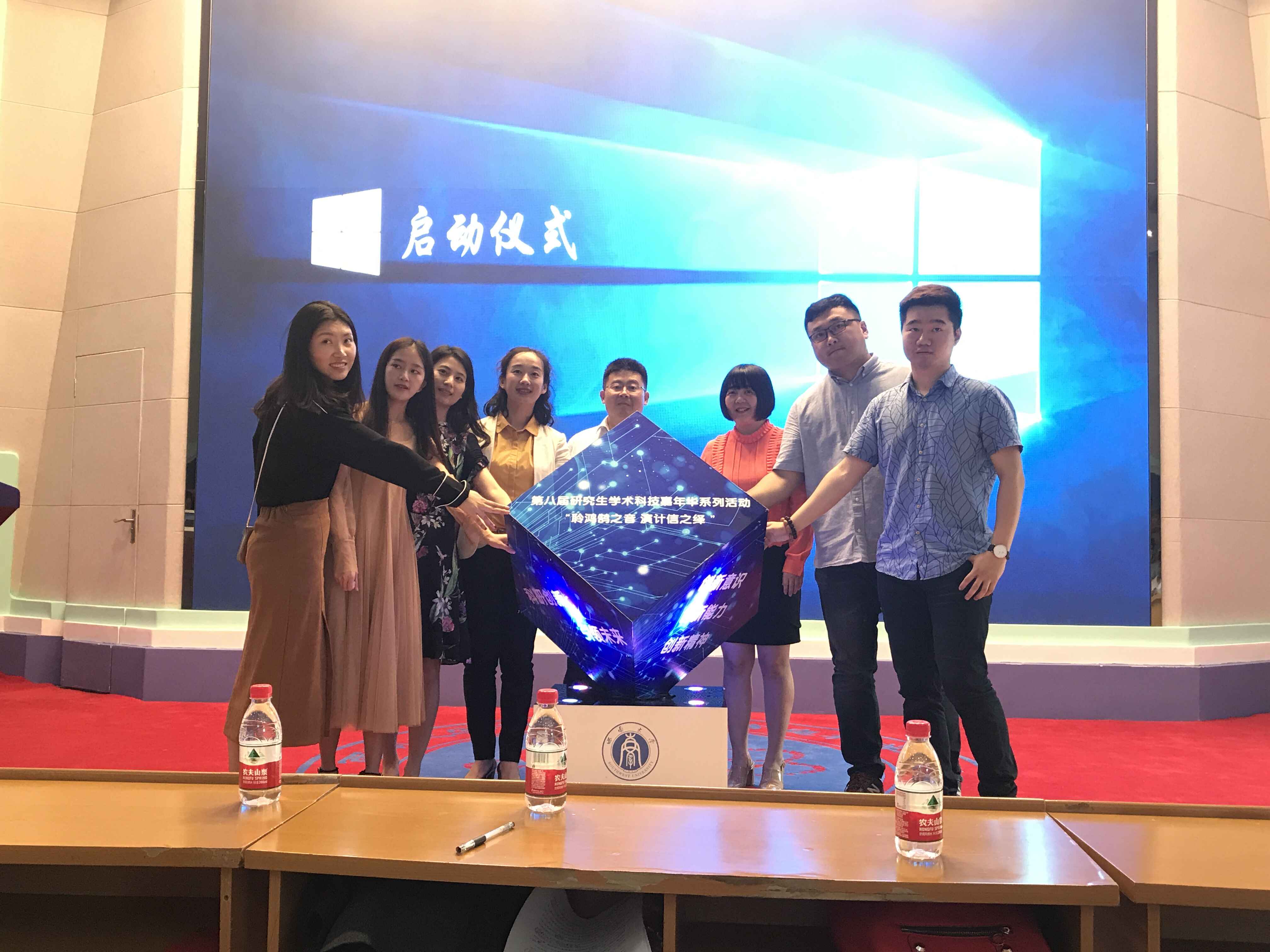 此后由院研究生会主席吕玲燕同学介绍此次学术科技嘉年华活动,号召同学们积极参与其中,感受浓厚的学术氛围和科技情怀,让同学们都迫切地想品尝学术大餐,亲身体验不一样的深度知识。随后到场的领导嘉宾共同上台启动魔方,宣告活动正式开幕。